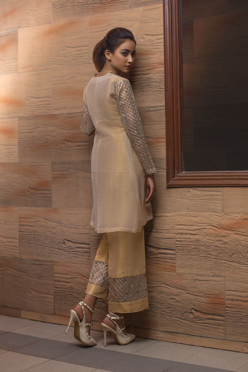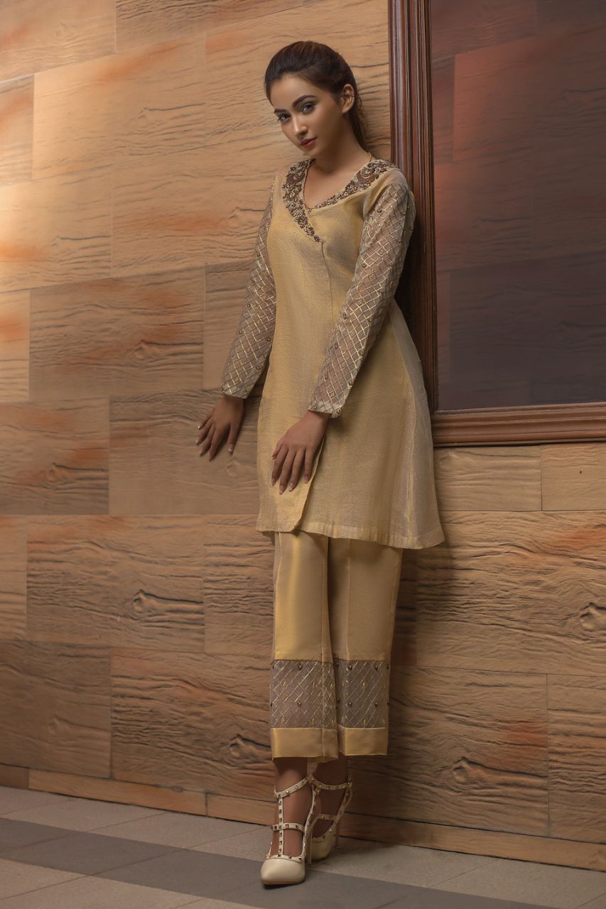 This elegant outfit features a luxuriously textured golden tunic adorned with delicate beadwork along the neckline for a touch of opulence. The full-length sleeves showcase intricate geometric embroidery with a subtle shimmer. Paired with straight-cut trousers that mirror the same elegant detailing at the hem. Crafted from premium fabric with a lustrous finish.