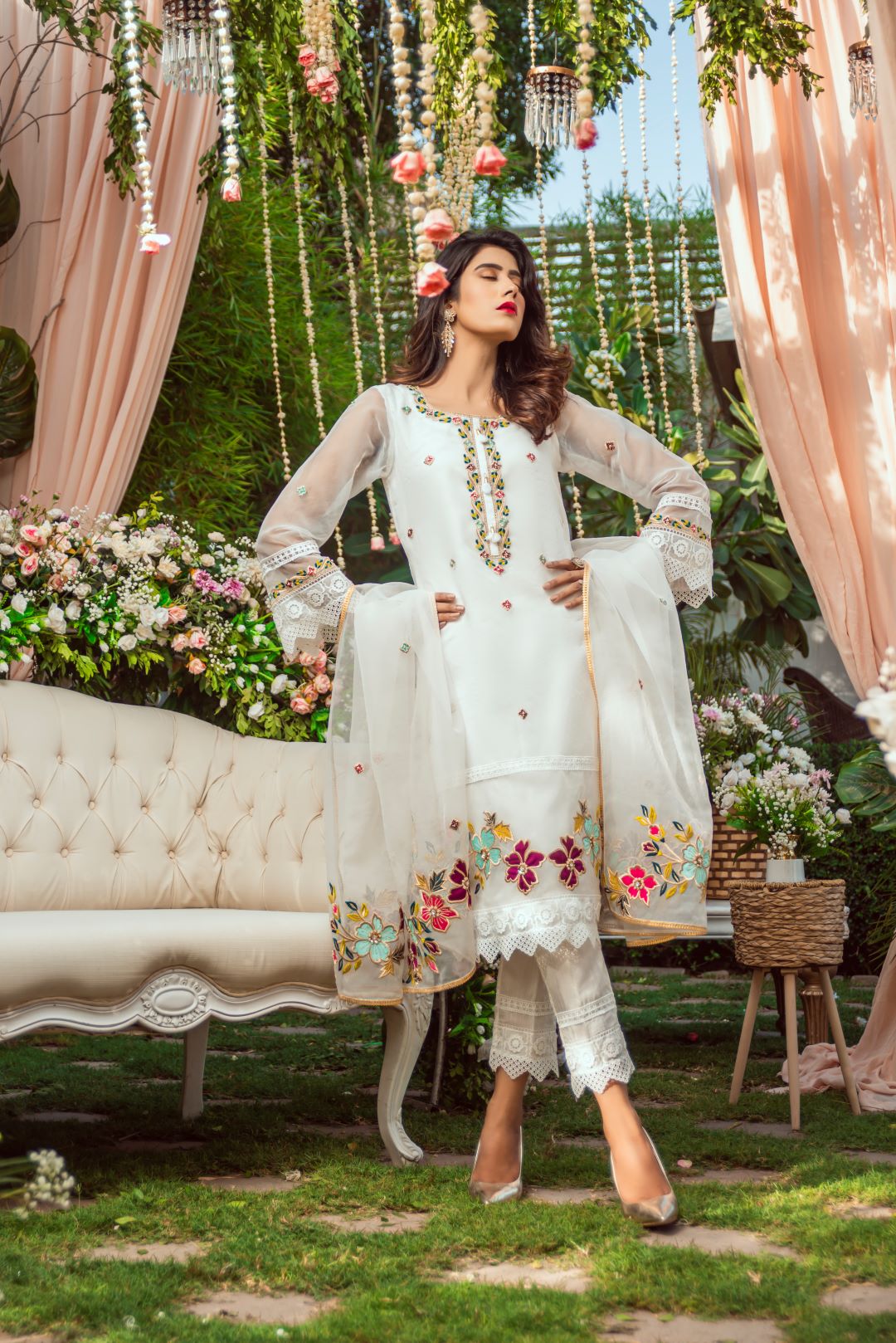 This three-piece suit features a pristine white base adorned with delicate multicolor floral applique and hand embroidery, adding a touch of vibrant charm to silhouette. The sheer organza sleeves and dupatta offer a soft ethereal appeal enhance by intricate lace detailing on the cuff and hem, paired with scalloped lace trimmed trousers.