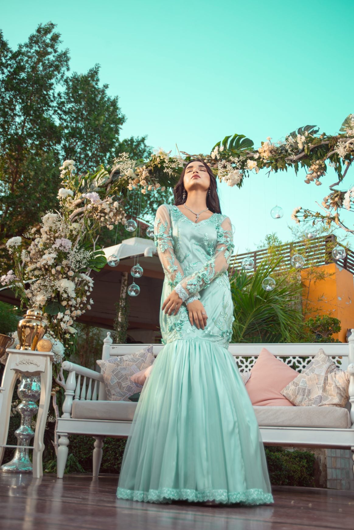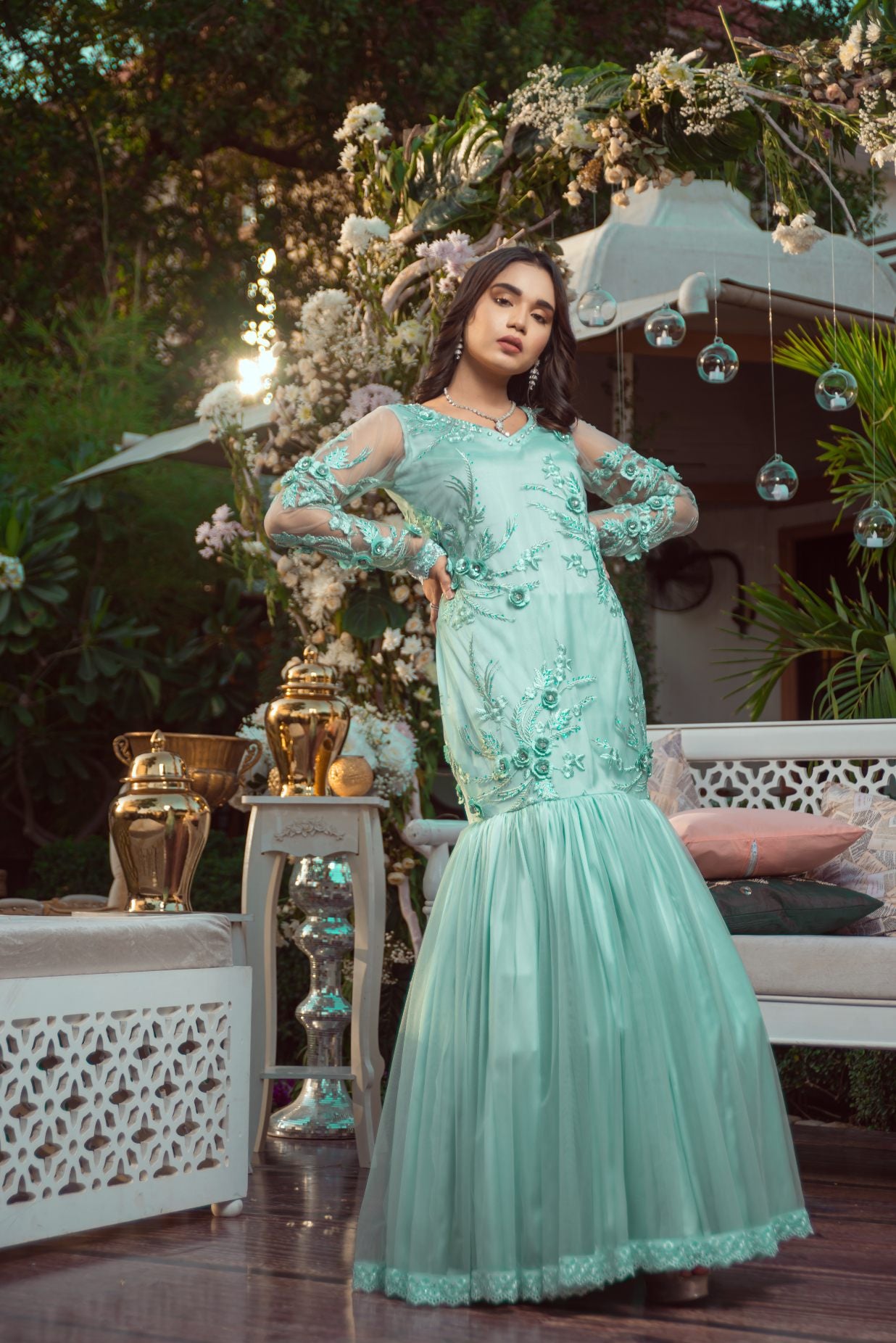 Our stunning creation in a mint hue that perfectly balances tradition with contemporary flair. Crafted from premium net and silk blend, this gown features delicate floral embroidery adorned with stones and beadwork, gracefully accentuating the bodice and sheer sleeves. The flared hemline adds a flowy charm, while intricate lace detailing at the bottom provides a touch of sophistication.