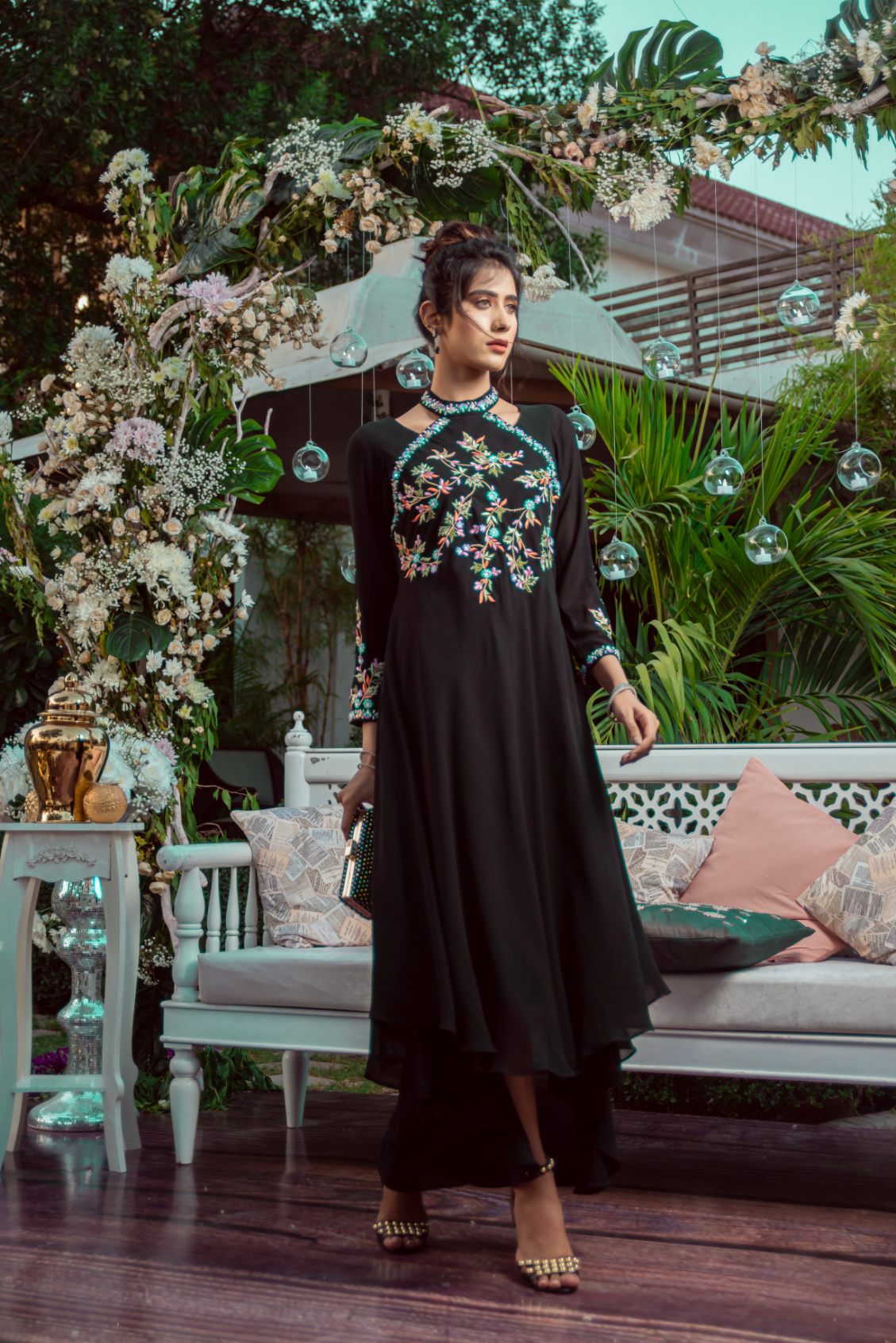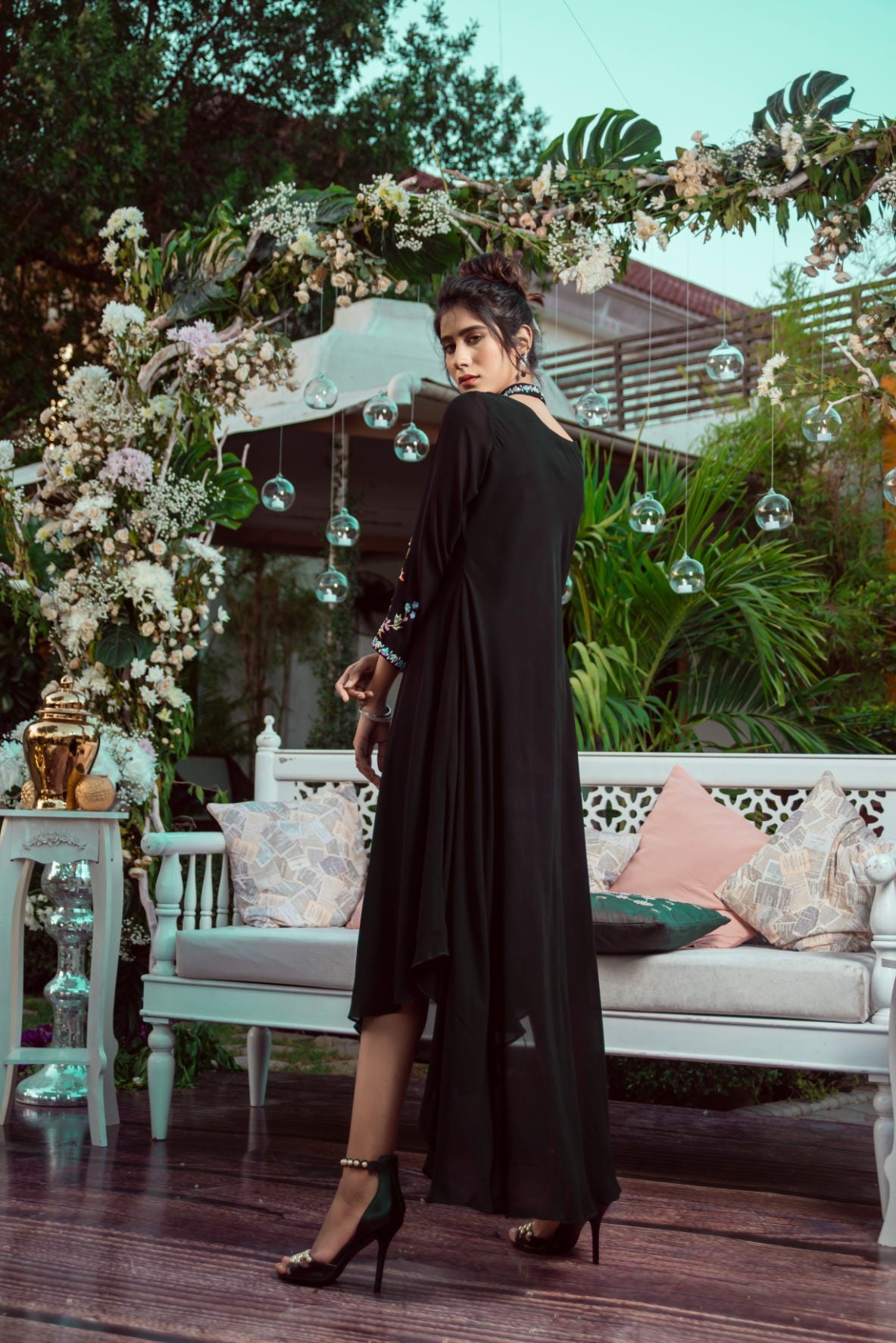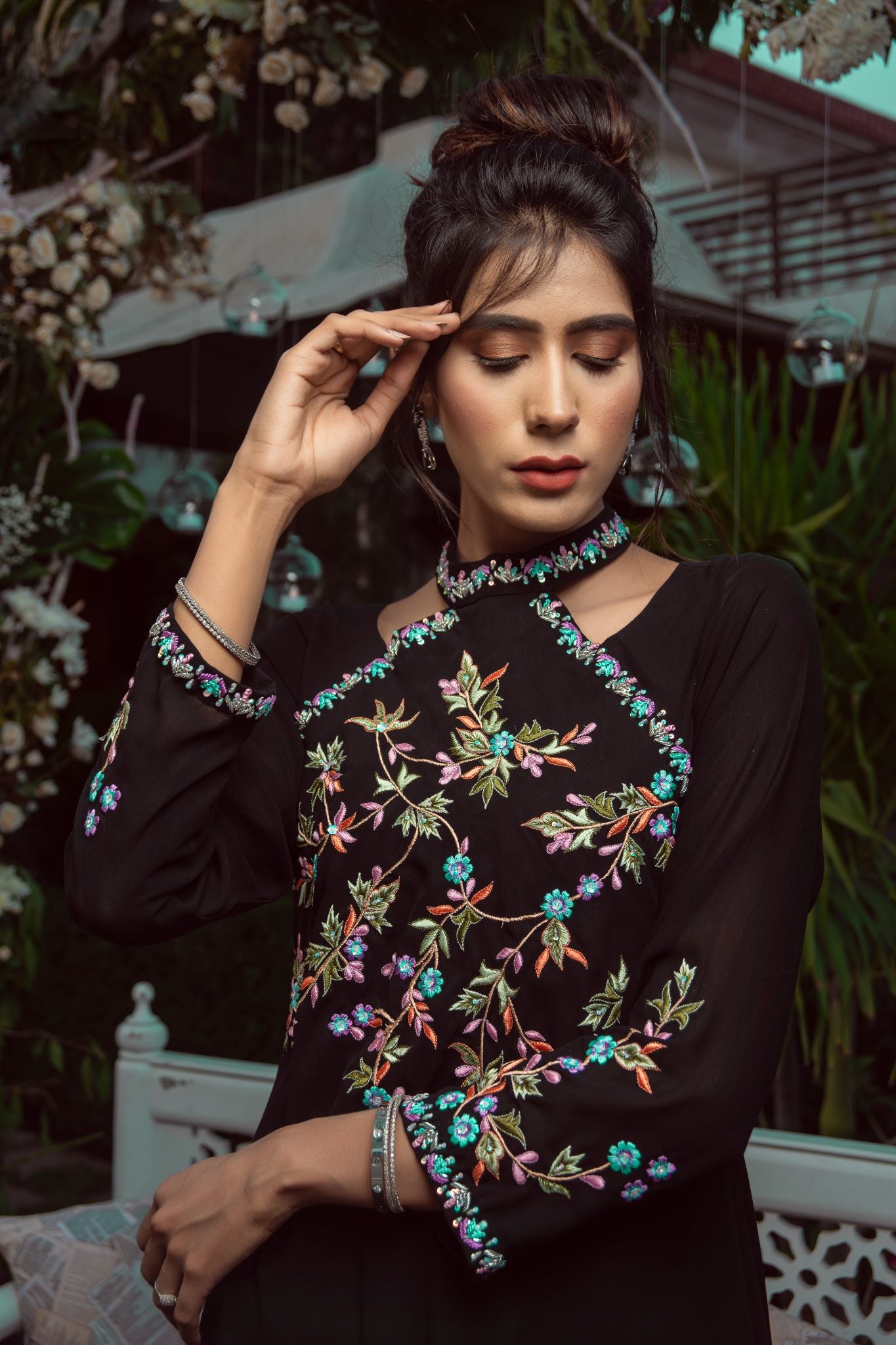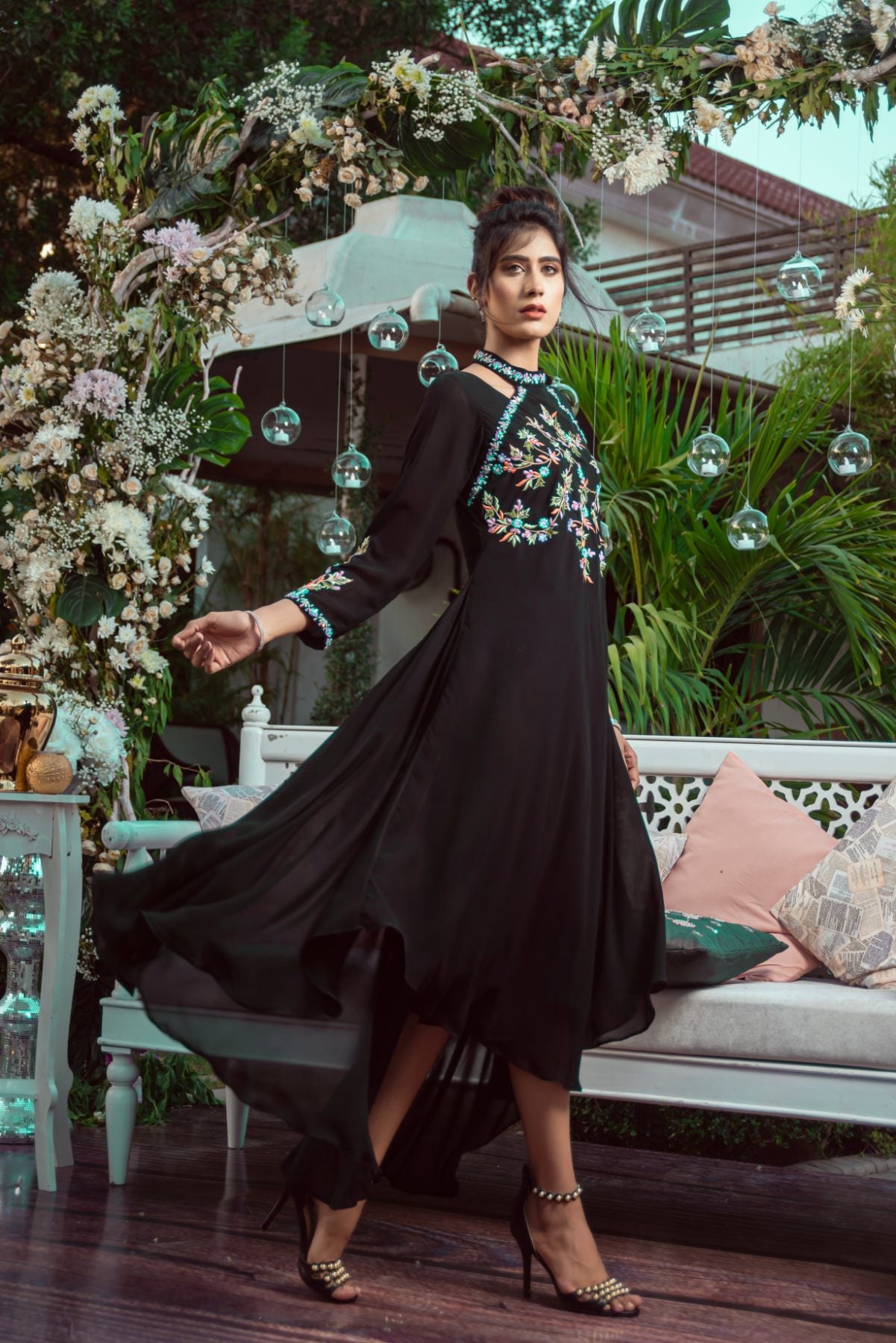 Command attention with timeless elegance in our 'Black Canvas', a modern classic crafted in luxurious georgette. Featuring a captivating high-low hemline, this flowing silhouette offers graceful moments with every step. Intricate multi-colored floral embroidery adorns the front and sleeves, contrasted beautifully with a delicate turquoise accent trim and embellished neckline.