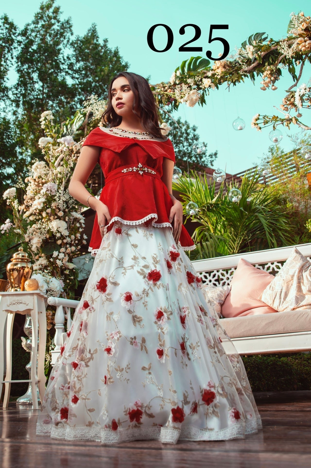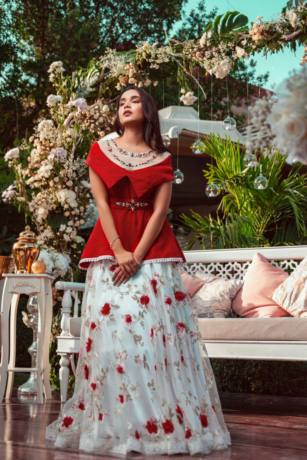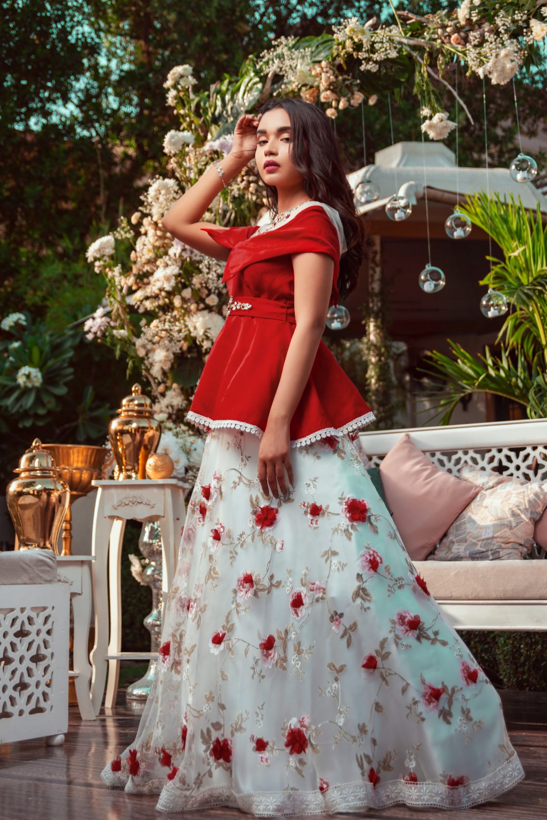 The deep red, off-shoulder bodice features a layered designed and a jeweled waistline, creating a flattering silhouette with a touch of vintage glamour. The voluminous skirt is adorned with exquisite floral embroidery in red and blush tones, blooming over a soft white base for a dreamy ethereal effect. Finished with dainty lace trim at the hem.