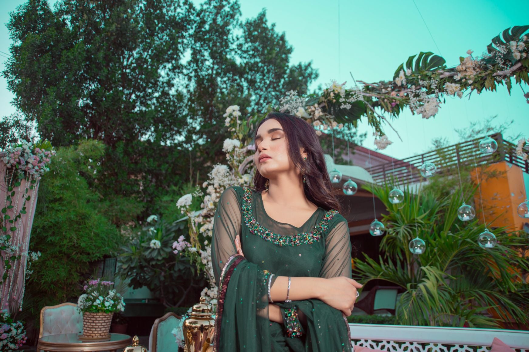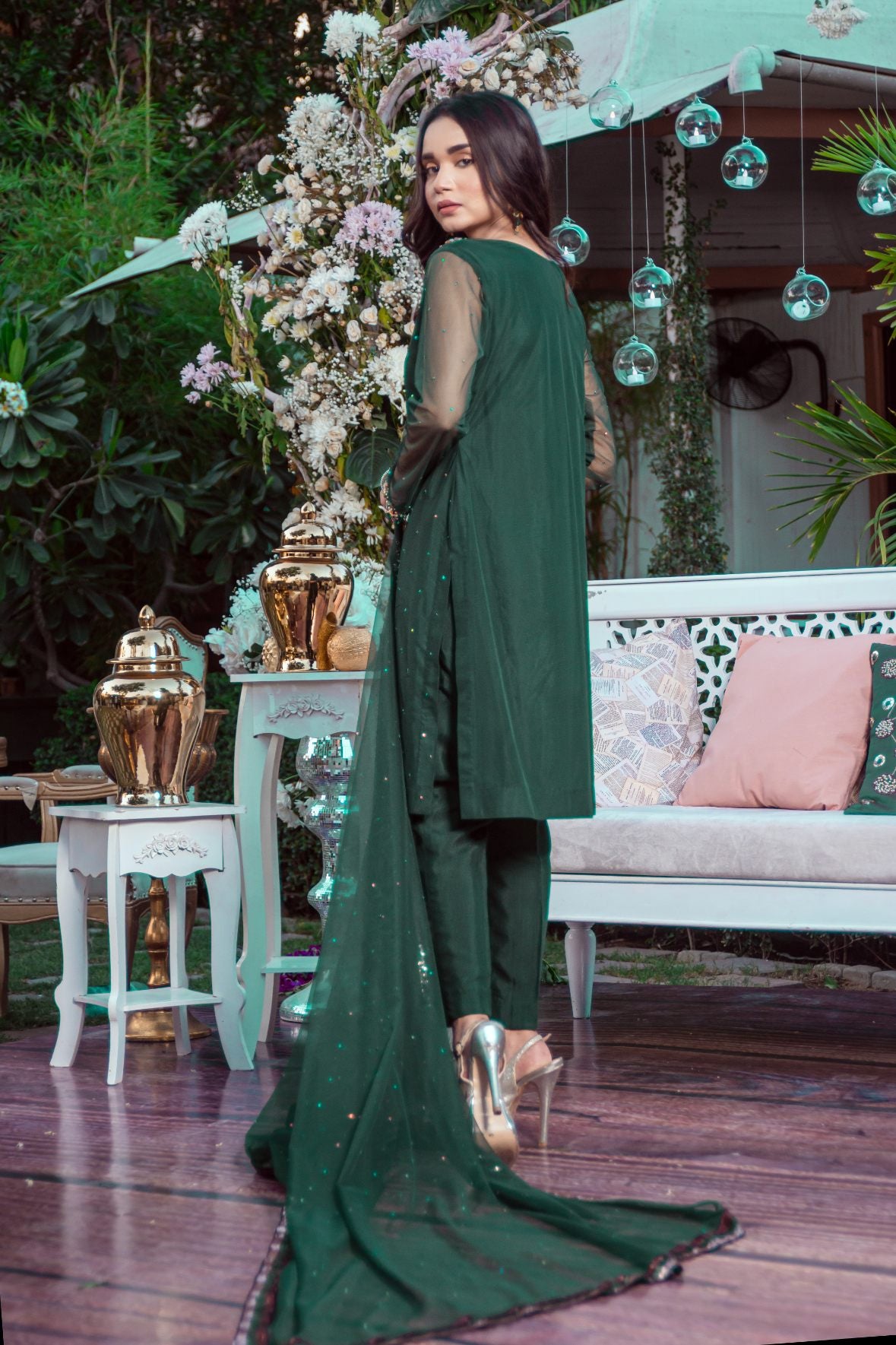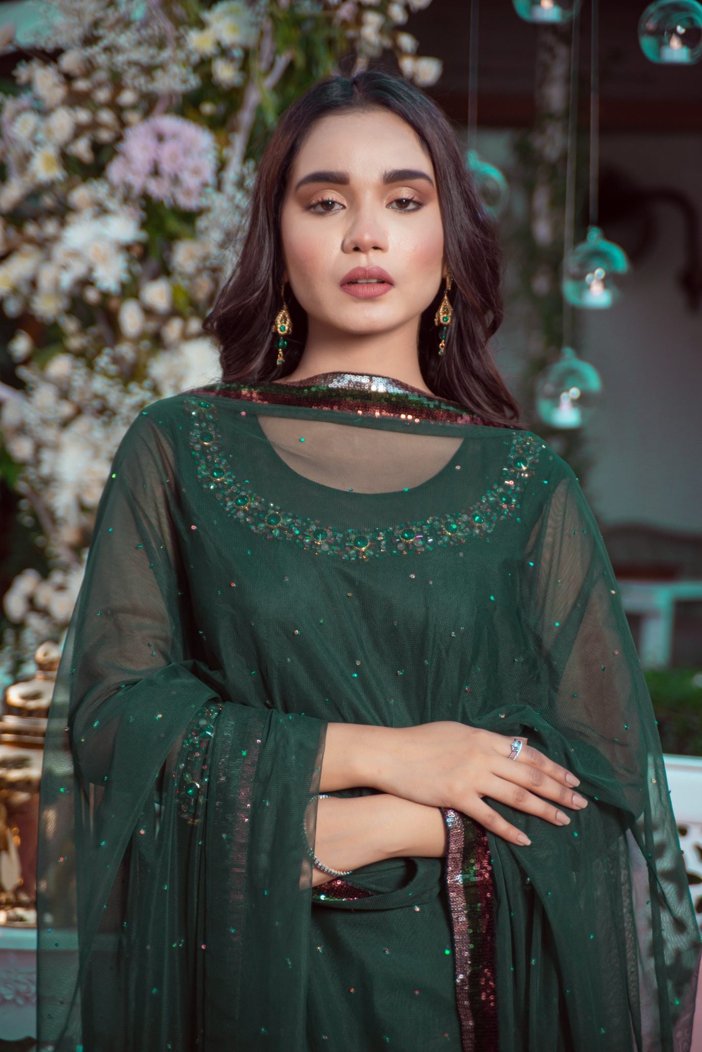 This stunning three-piece suit features a delicately hand-embellished neckline and cuffs, subtly adorned with shimmering sequins that catch the light beautifully. The sheer full-length sleeves add a soft feminine touch, while the matching straight pants and flowy dupatta complete the ensemble with effortless sophistication.