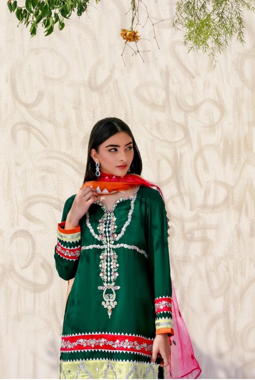 Color: Dark green shirt with fuchsia pink & butter yellow borders, dark green matching, double-toned (pink and orange) dupatta