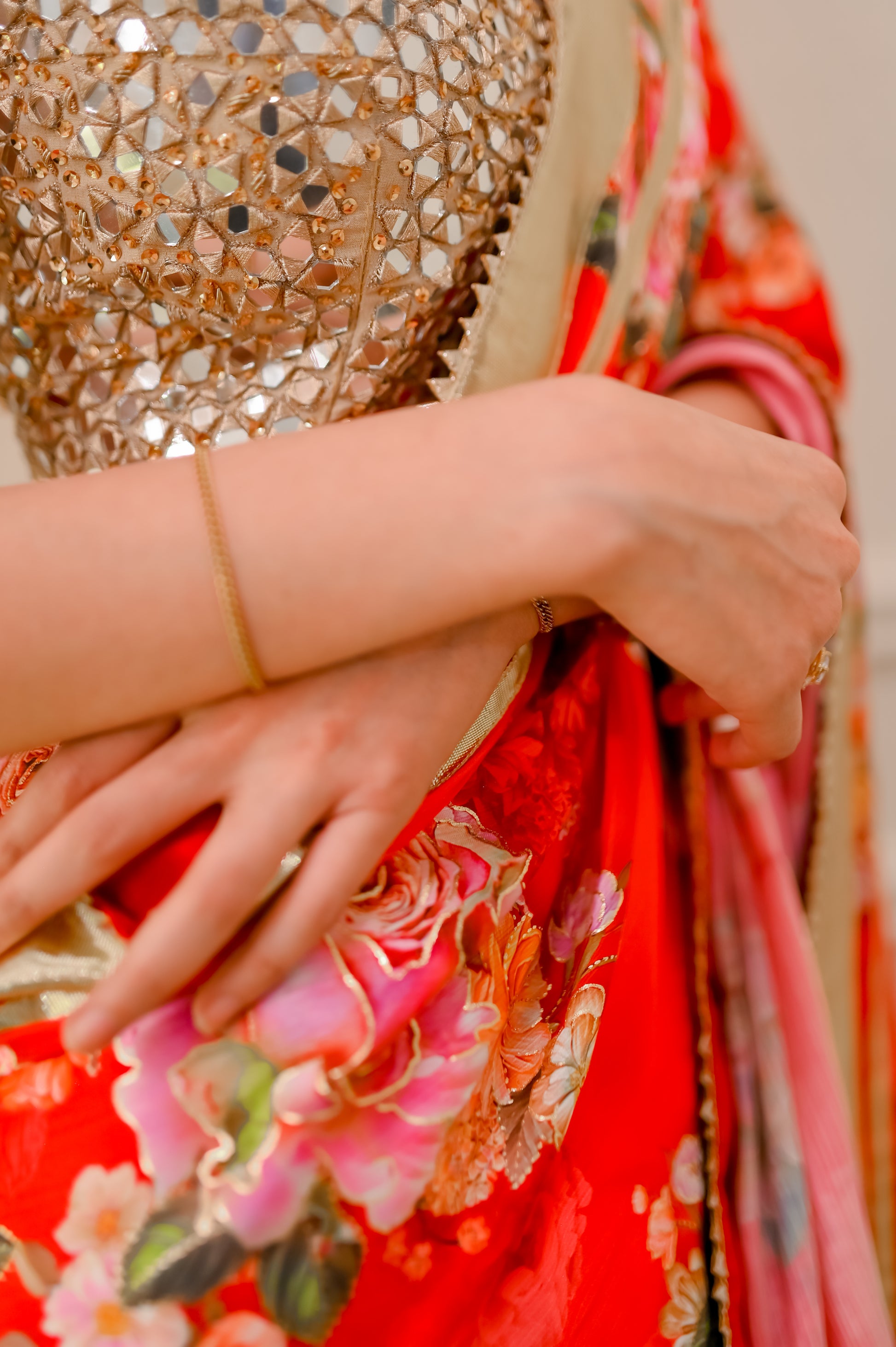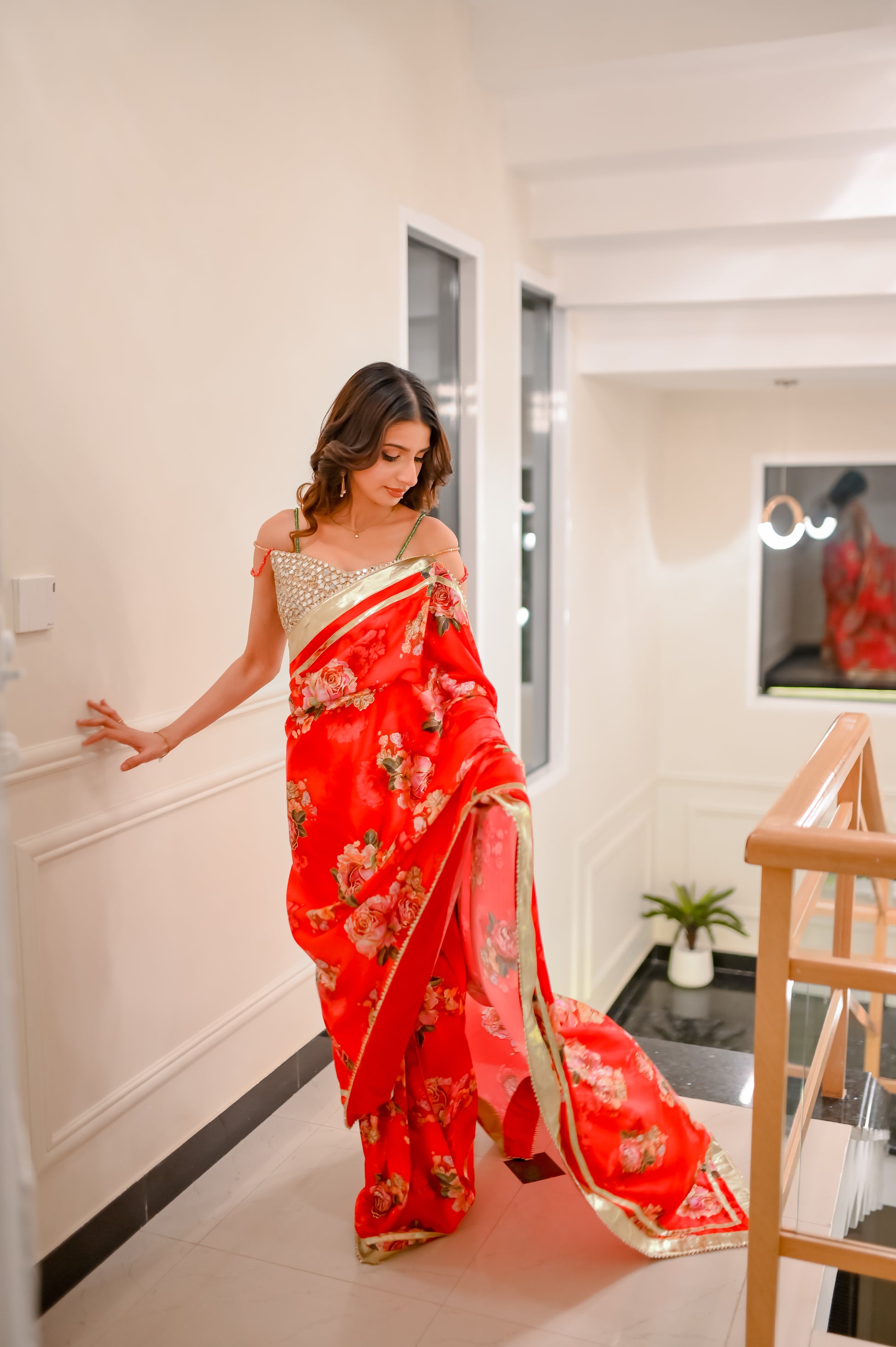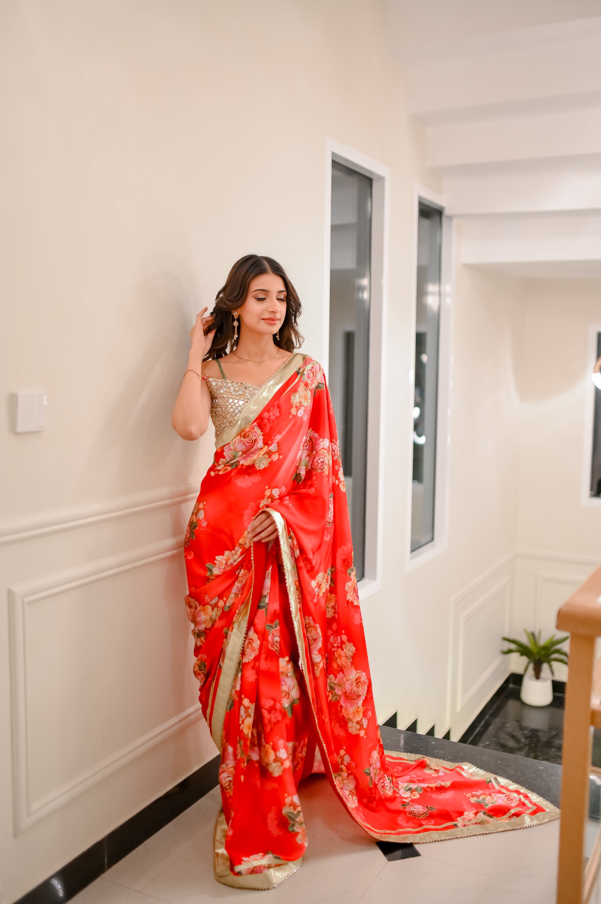Elevate your festive wardrobe with this stunning scarlet red satin saree, beautifully adorned with a vibrant floral print that exudes timeless grace and femininity. The soft satin fabric drapes elegantly, offering both comfort and a luxurious sheen that catches the light effortlessly. Accented with a subtle gold border. Paired with a shimmering blouse with mirror work all over it. Featuring delicate strap and shoulder details.