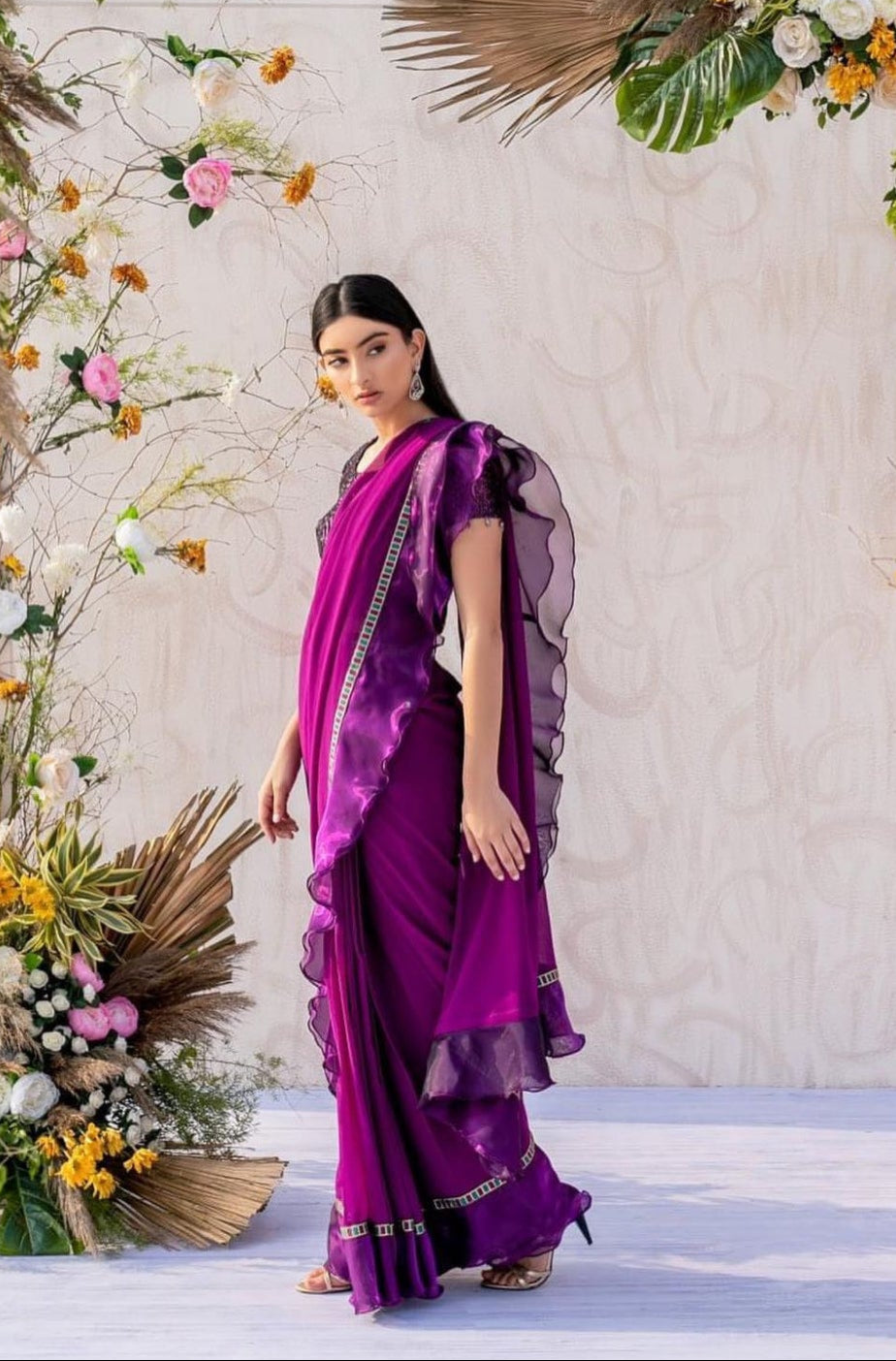 Fabric: Sequin blouse, chiffon saree, organza ruffles