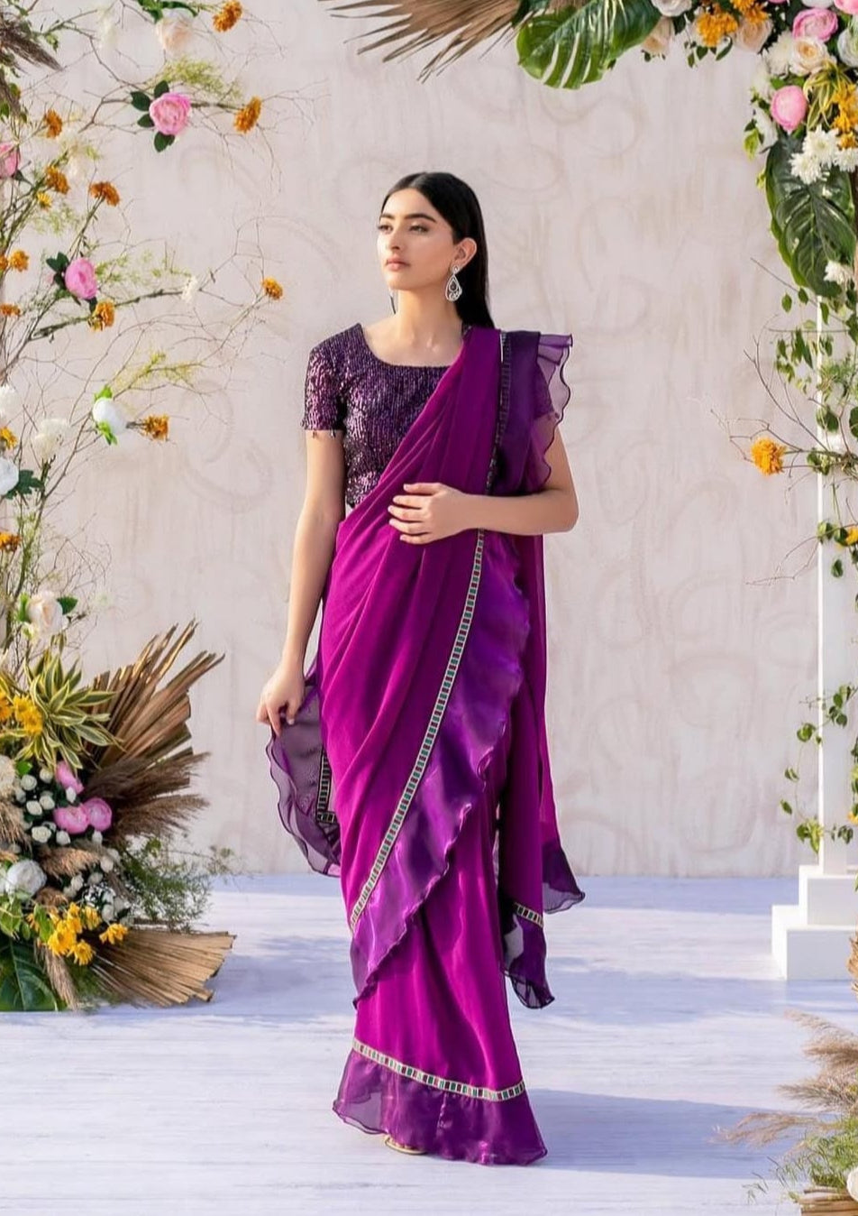 The saree features ruffled edging and a subtle magenta and gold sequin border. It’s paired with a matching short sleeved blouse covered in glittery Sequins. This look is sophisticated, ideal for formal parties or evening weddings.