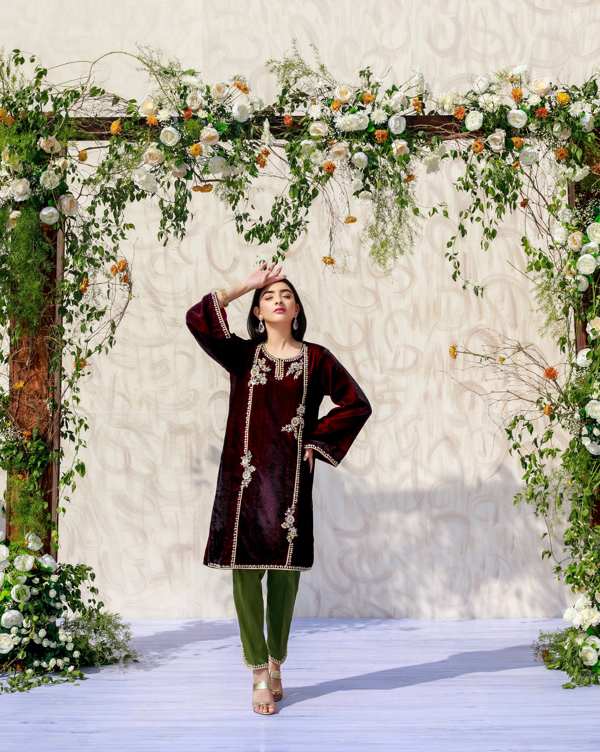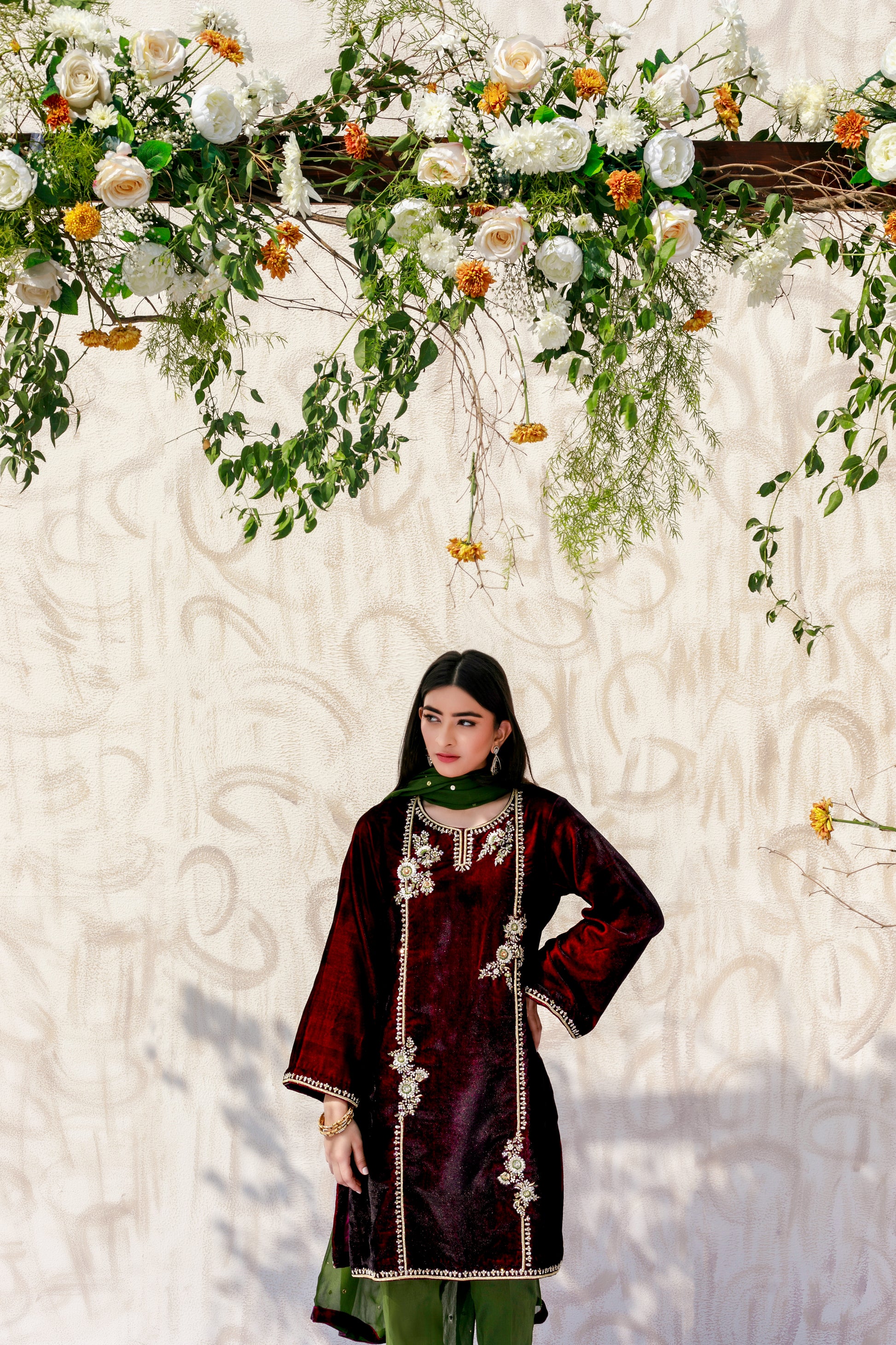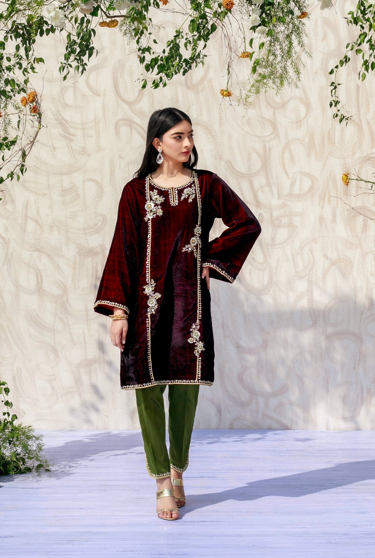 Crafted in sumptuous maroon velvet, the shirt features intricate gold and silver floral embellishments, delicately hand worked to perfection.