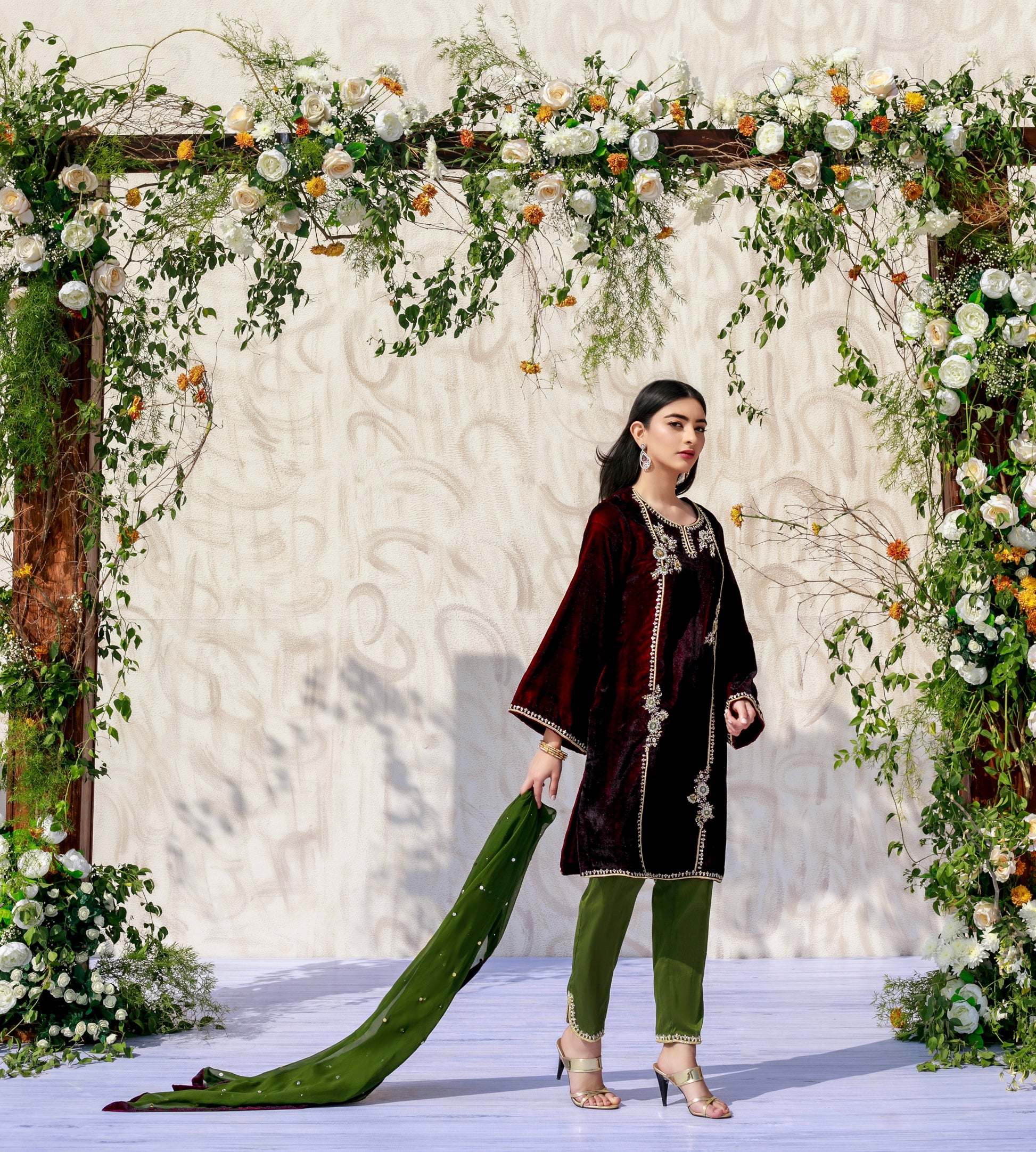 Color: Deep Maroon Shirt with Olive Green Bottom & Dupatta