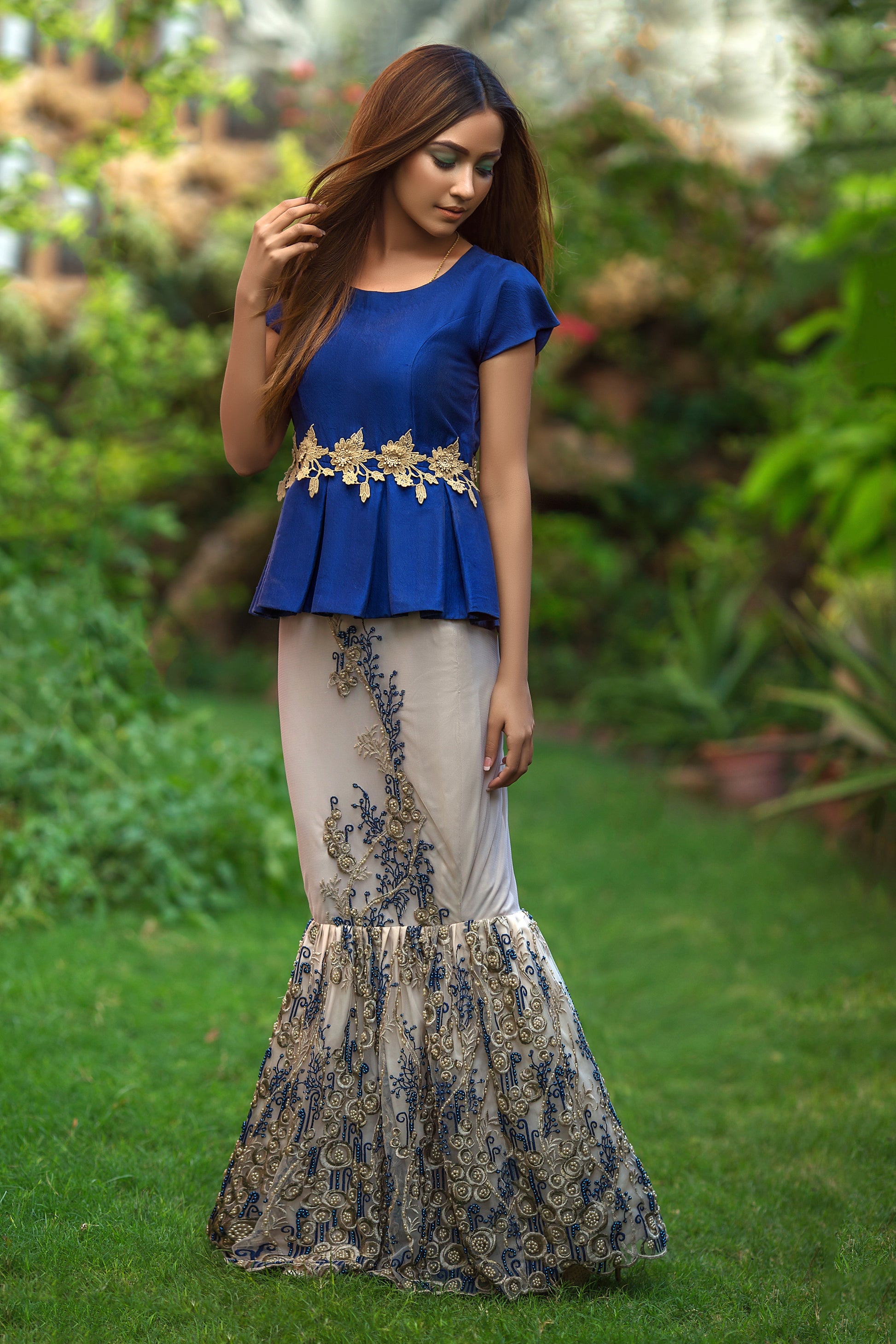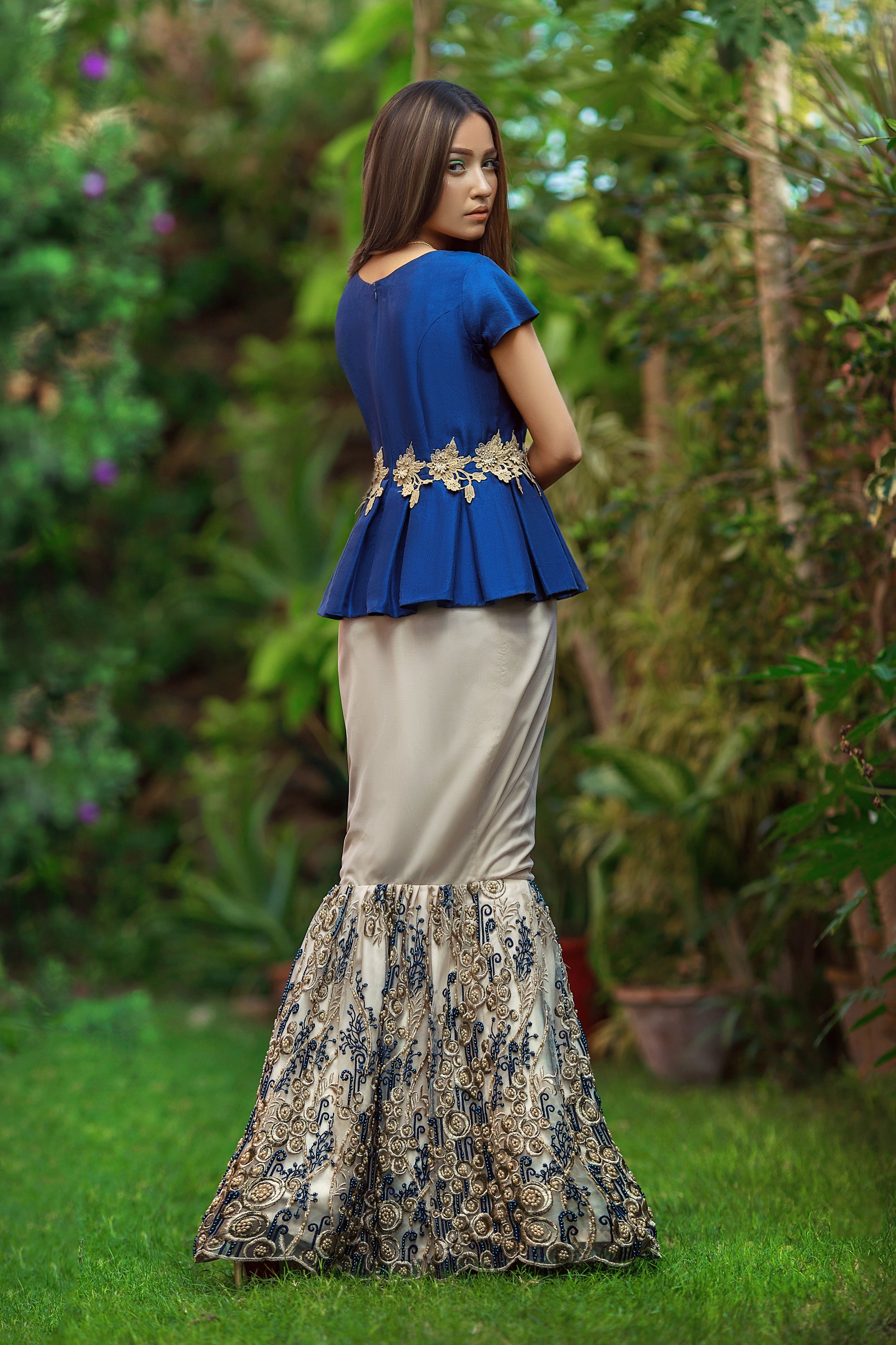 Color: Royal blue peplum top with cap sleeves, ivory floral lace detailing at the waist, ivory mermaid skirt with heavy navy and gold embroidery.