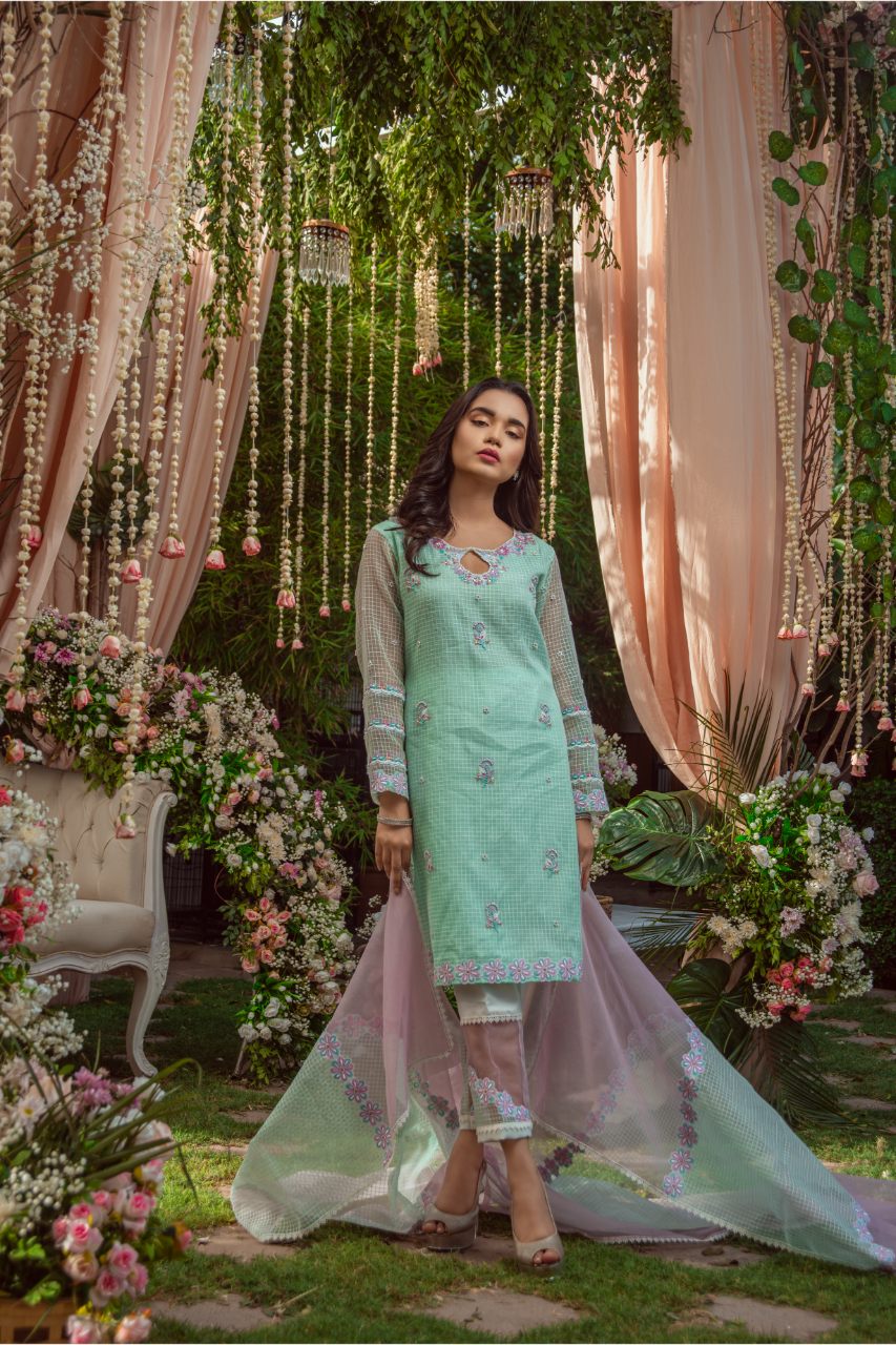 The kurta features delicate floral embroidery on a subtle checkered base, with sheer organza sleeves adorned with intricate detailing for a romantic touch. A soft keyhole neckline adds modern elegance, while the matching straight pants and pastel lilac dupatta with floral borders elevate the overall look. The flowing dupatta with a trail effect brings grace and grandeur.