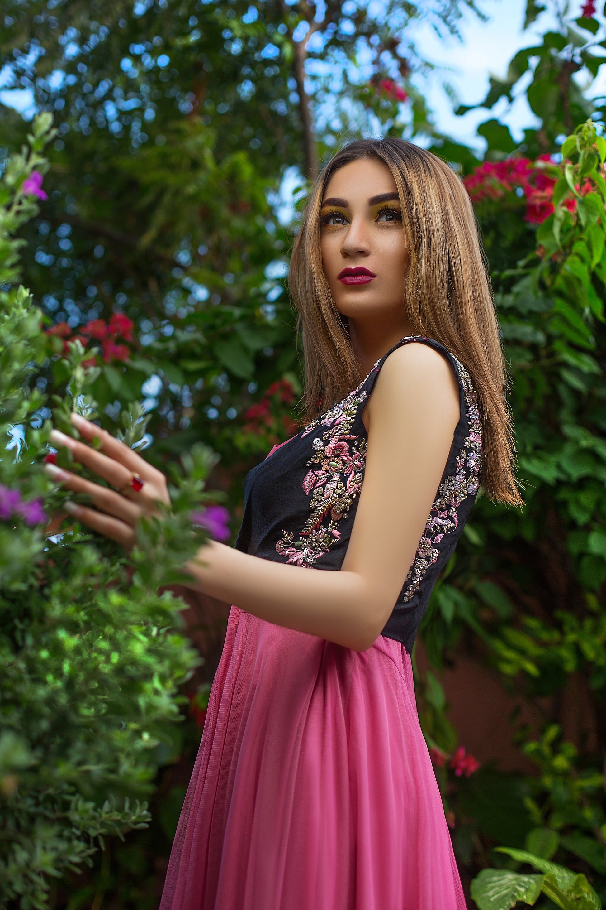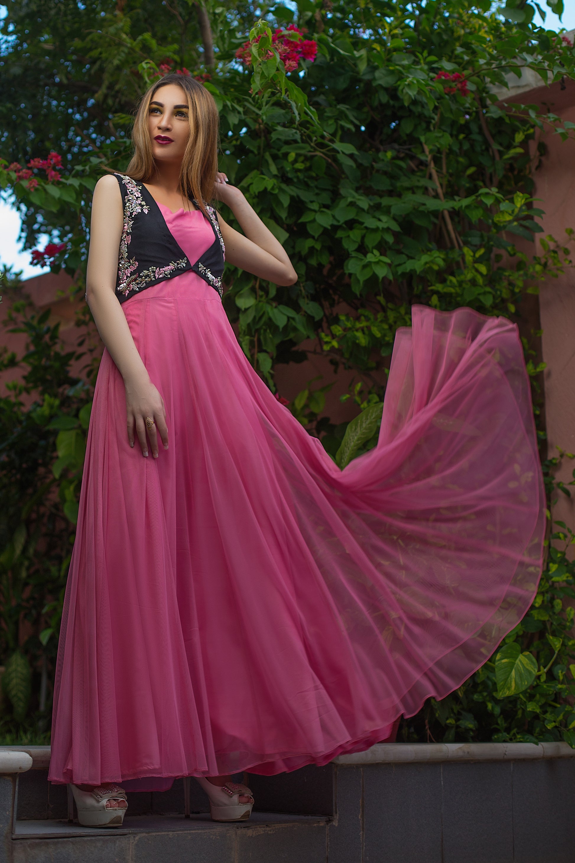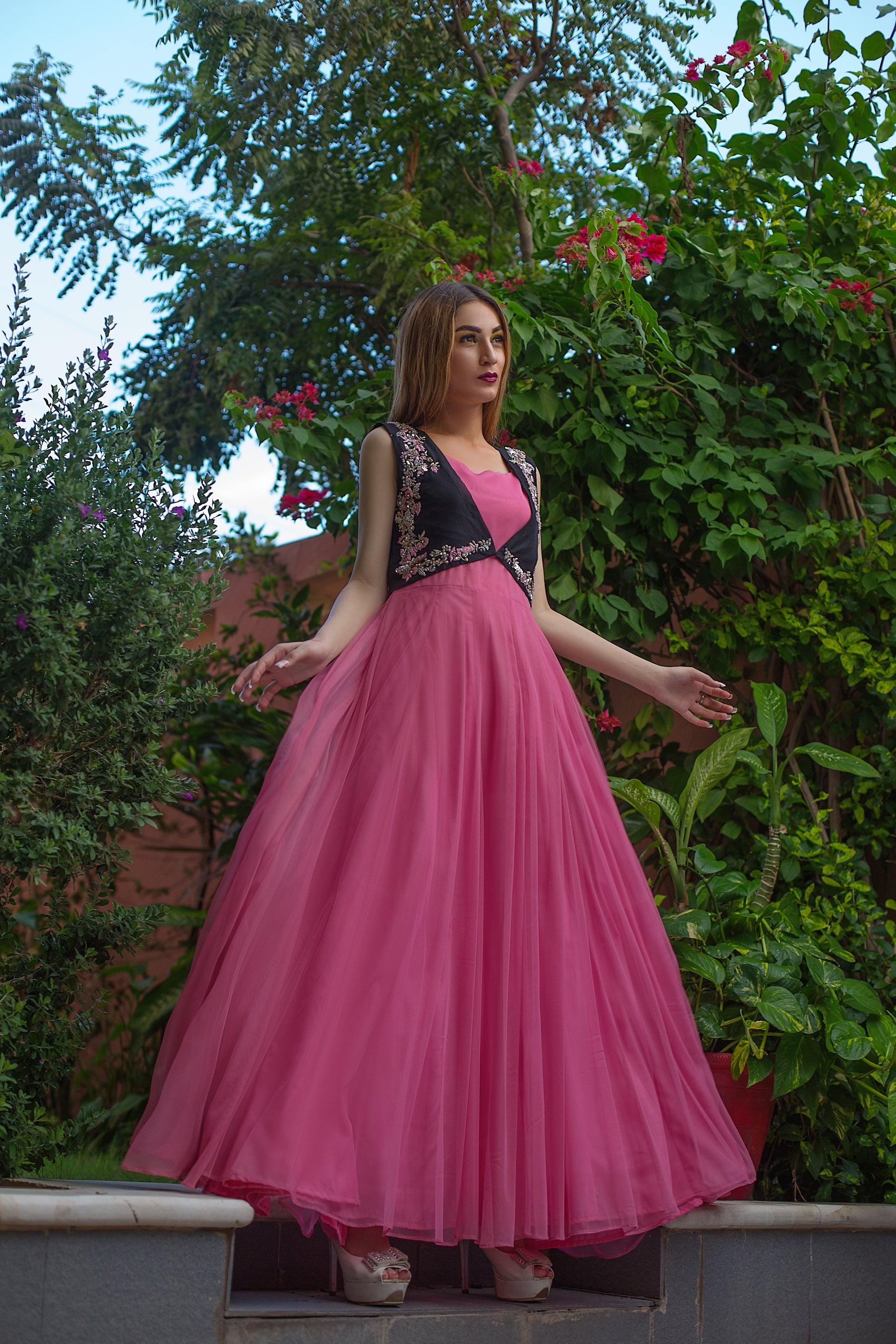 Crafted with layers of soft tulle, the flowing skirts creates a dreamy silhouette perfect for formal events or evening occasions. The sleeveless design features a contrasting black bodice vest adorned with intricate floral embroidery.