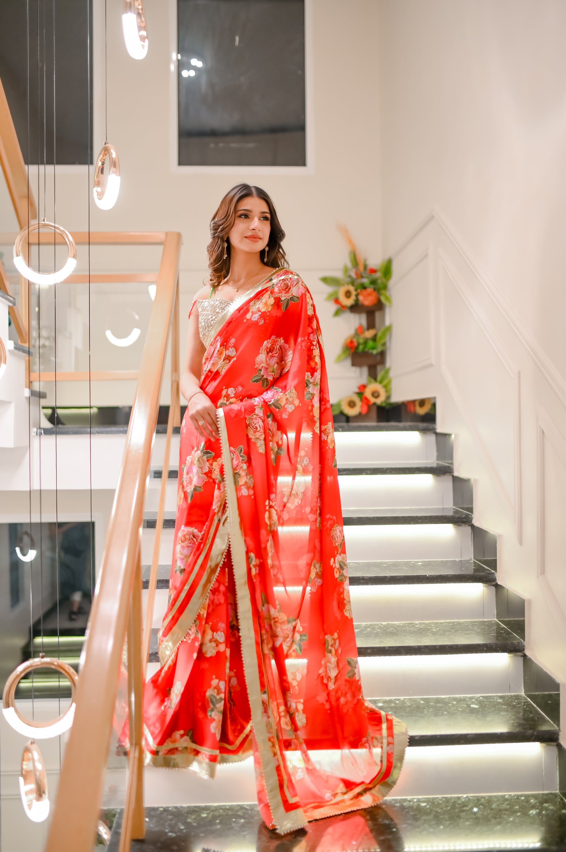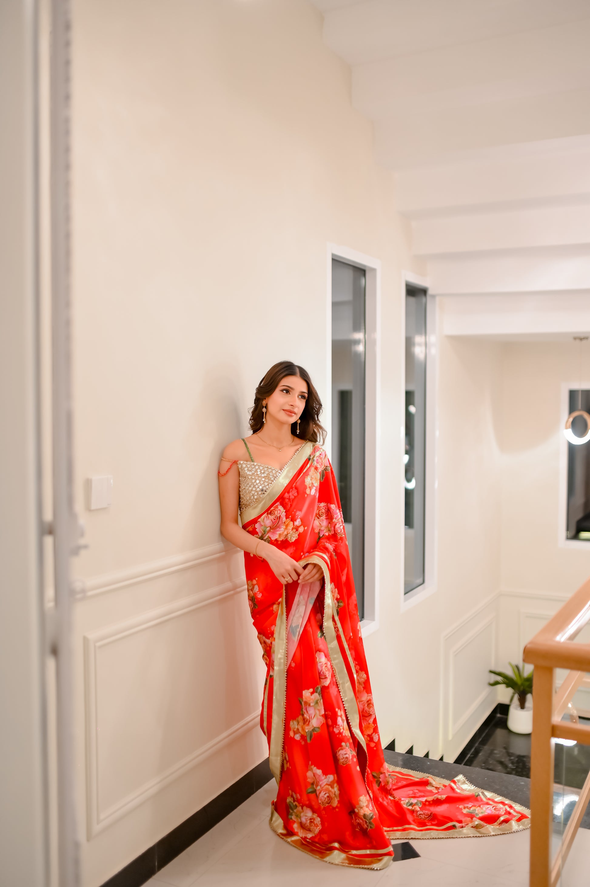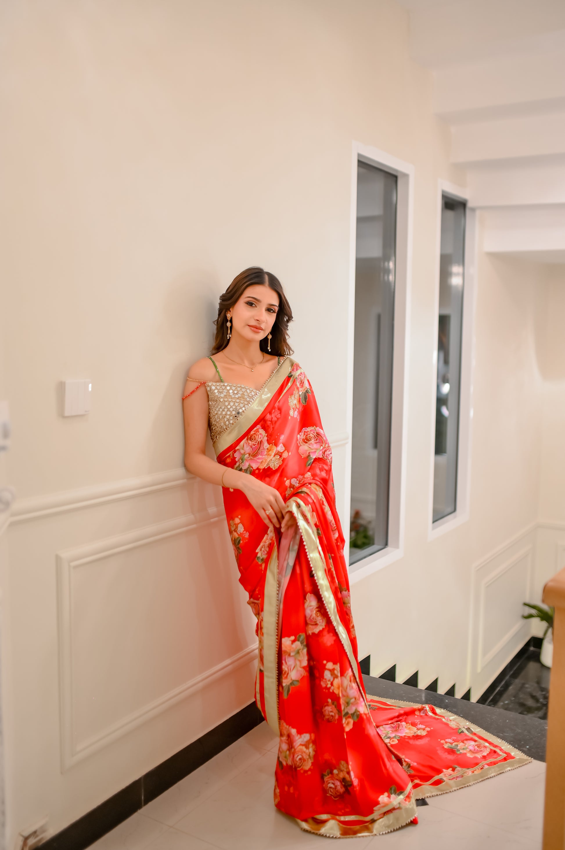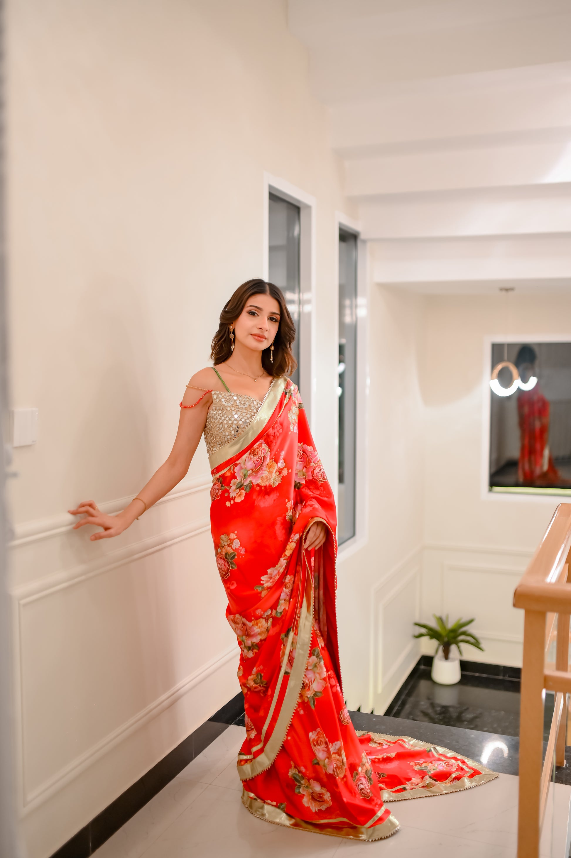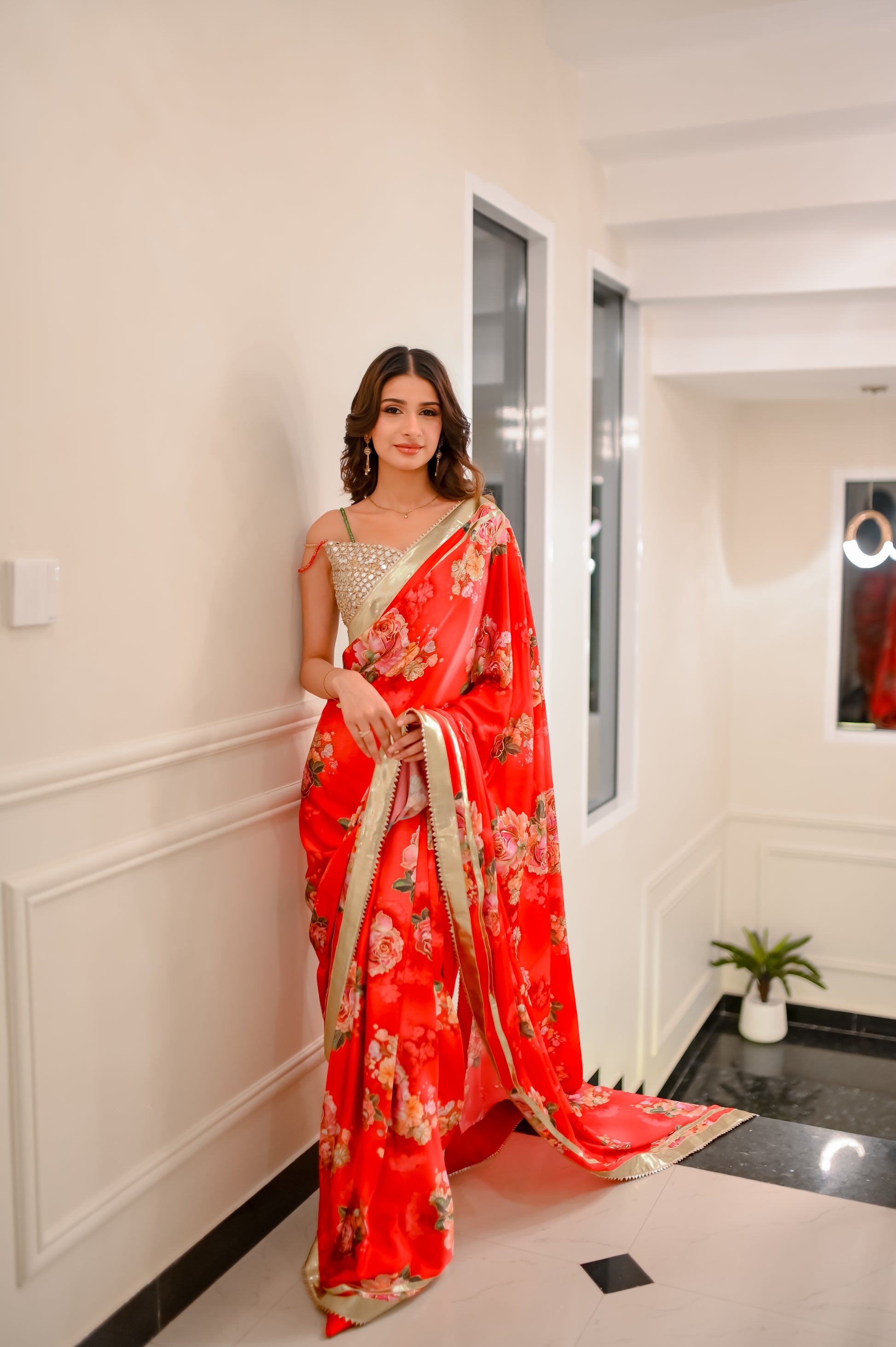 Elevate your festive wardrobe with this stunning scarlet red satin saree, beautifully adorned with a vibrant floral print that exudes timeless grace and femininity. The soft satin fabric drapes elegantly, offering both comfort and a luxurious sheen that catches the light effortlessly. Accented with a subtle gold border. Paired with a shimmering blousewith mirror work all over it. Featuring delicate strap and shoulder details.