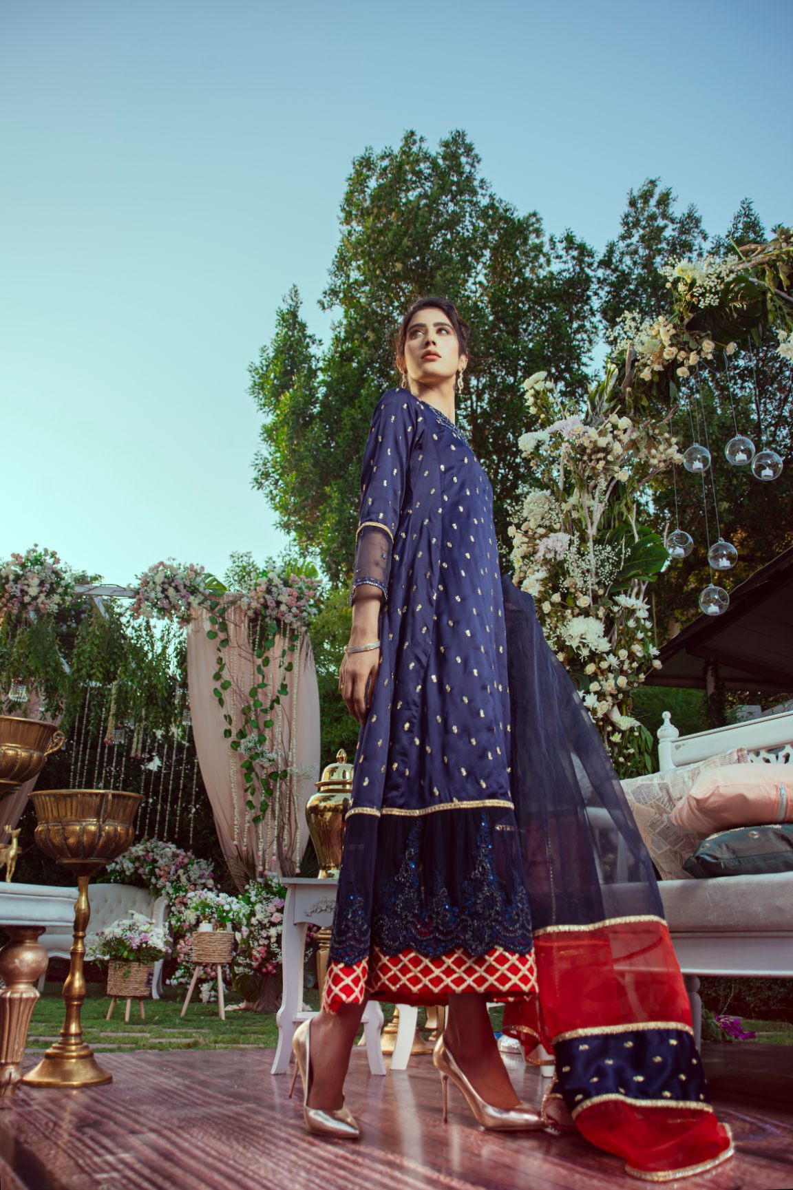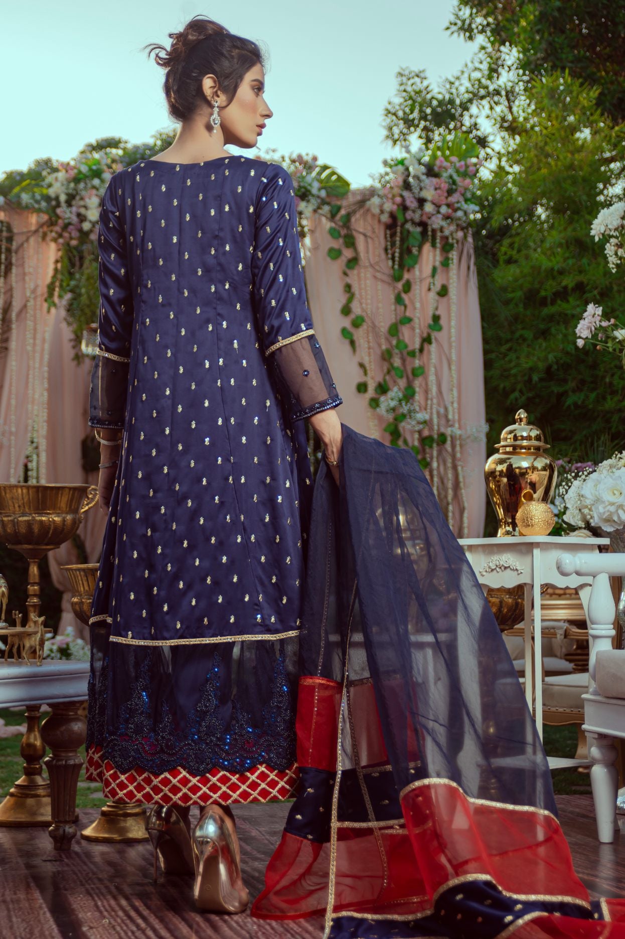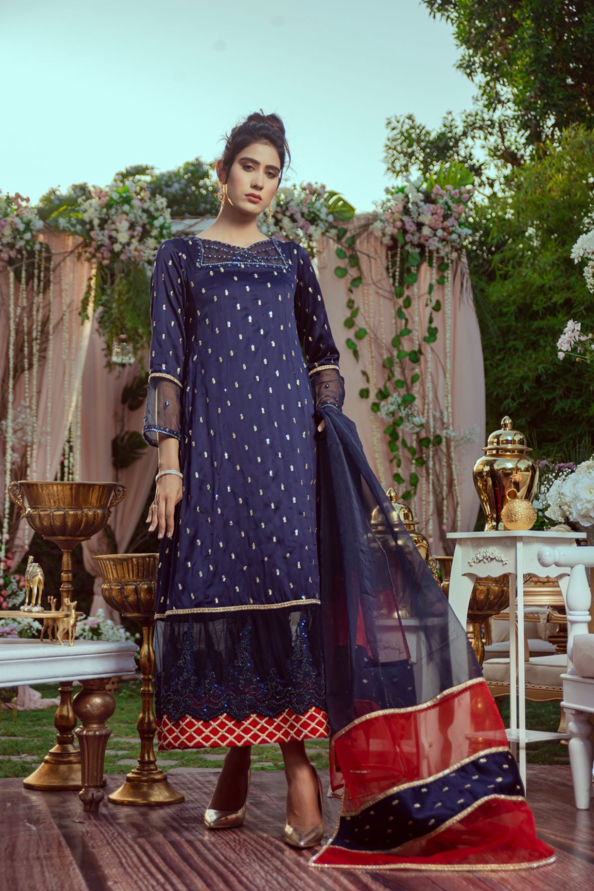 The kurta is adorned with delicate gold motifs and intricate sequin work, complemented by sheer embellished sleeves and a beaded neckline that adds a hint of glamour. A richly embroidered lace border graces the hem, beautifully layered over a vibrant red and gold contrast inner panel for a striking finish. The look is completed with a flowy net dupatta, finished in deep blue and crimson red with gold detailing.