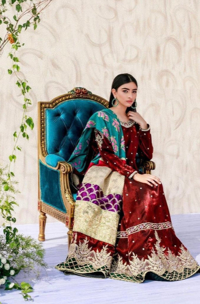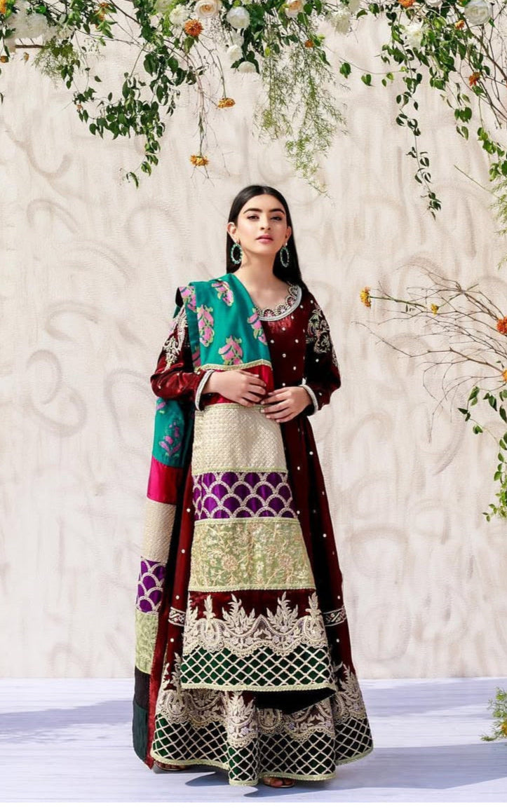 The look is completed with a vibrant, contrast dupatta, in teal adorned with floral block print patterns, and embroidered borders, This outfit is a true celebration of craftsmanship.