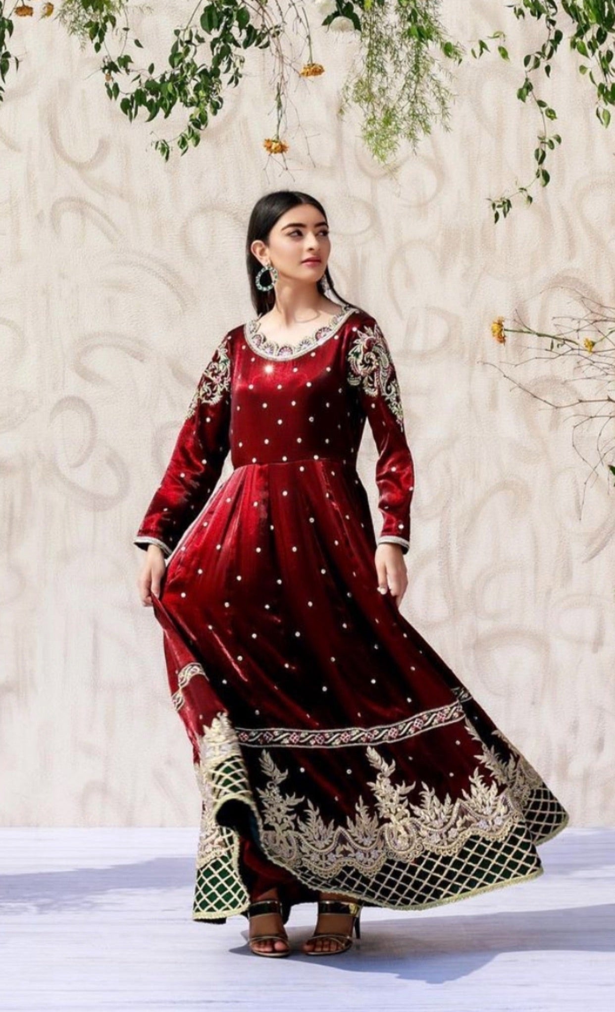 This floor length dress features intricate zardozi work with gold zari and thread embroidery, gracefully adoring the hemline and sleeves with traditional motifs, delicate cutwork on front and back neckline, sequins accents scatter across the entire gown.