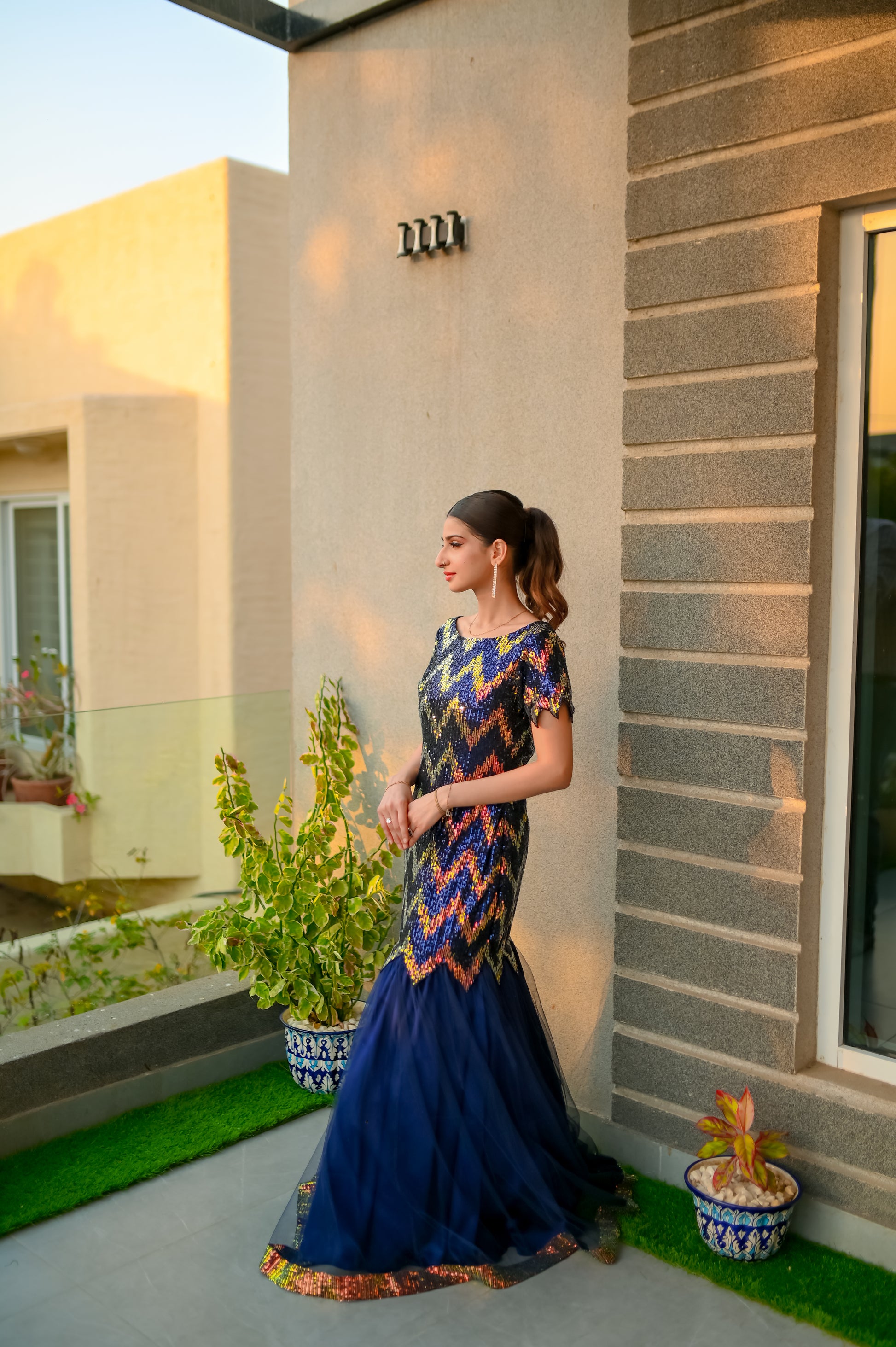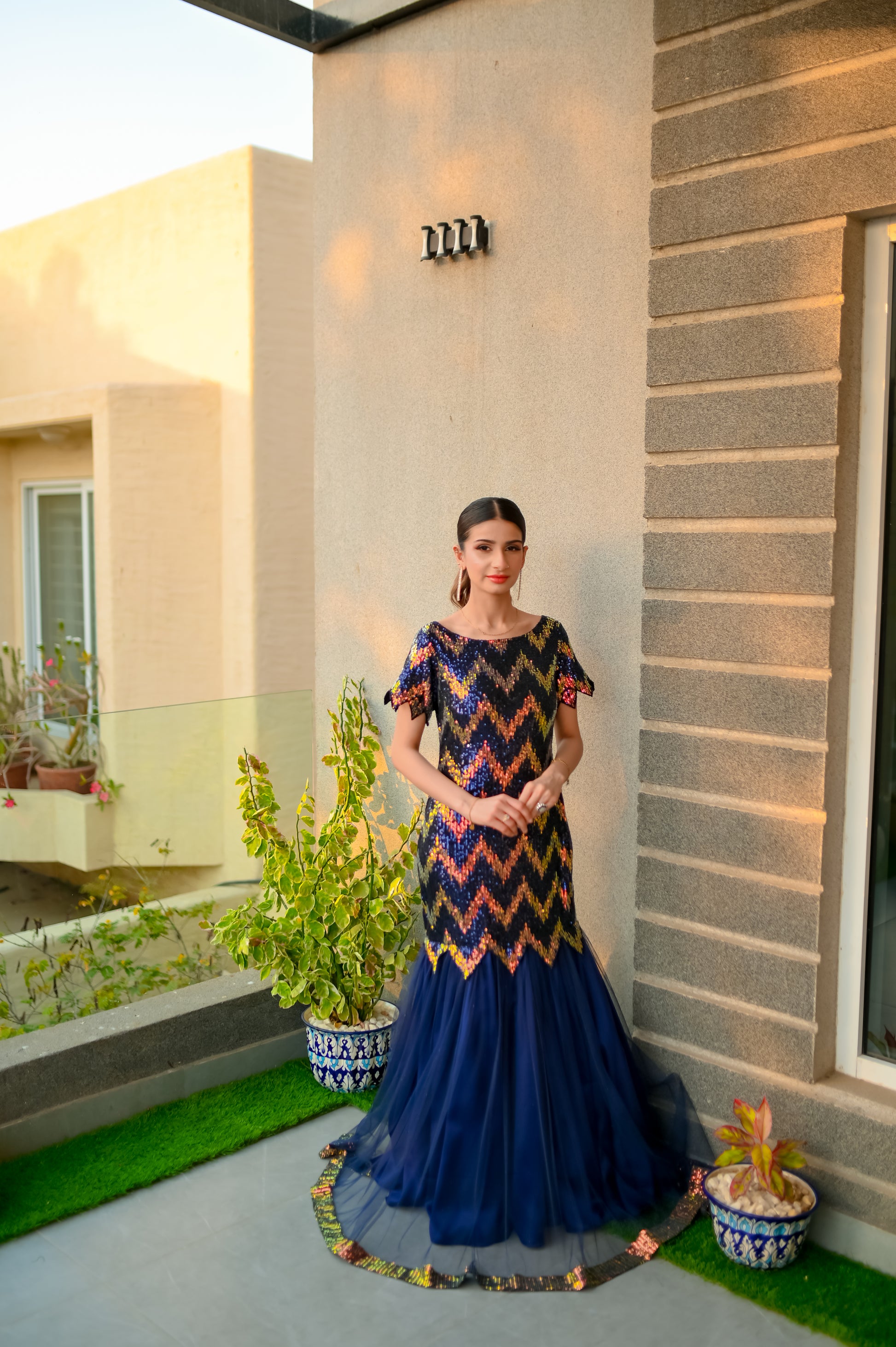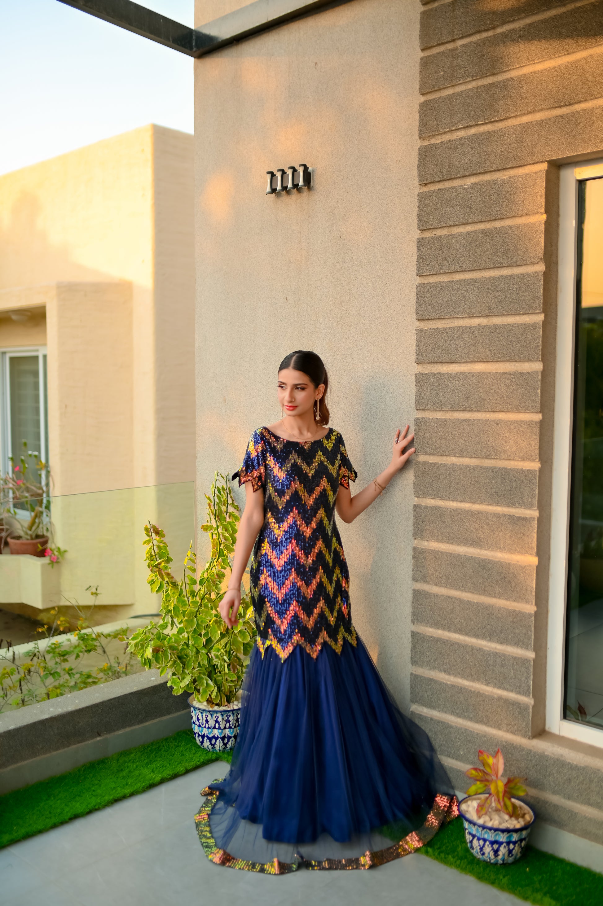 Navy-blue gown designed to dazzle. Featuring a richly embellished chevron sequin pattern across the bodice in hues of gold, orange and blue, this outfit perfectly balances tradition with modern flair. The short, fringed sleeves add a playful edge, while the voluminous net flare brings drama and elegance to every step. Ideal for evening soirées receptions, or festive celebrations.