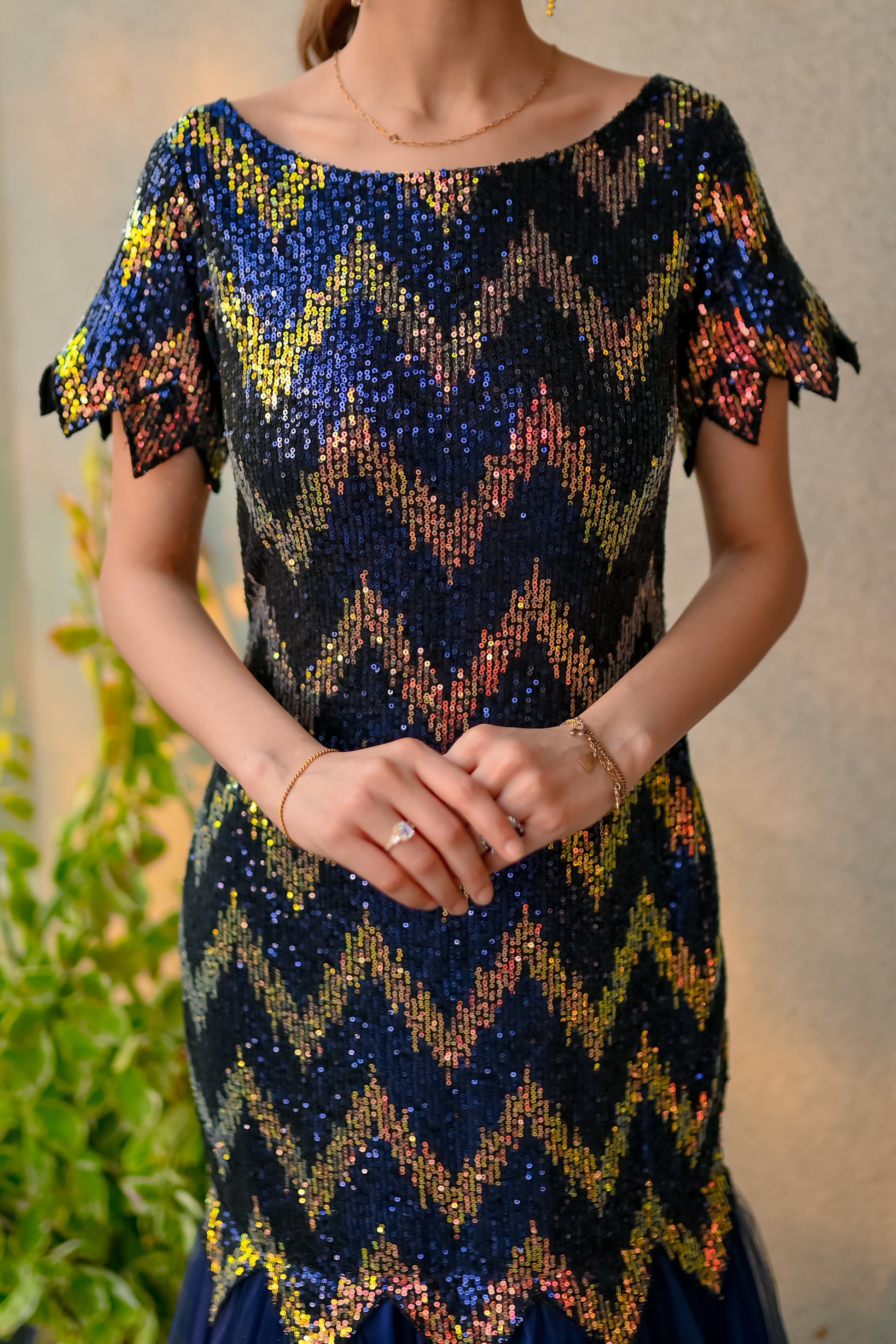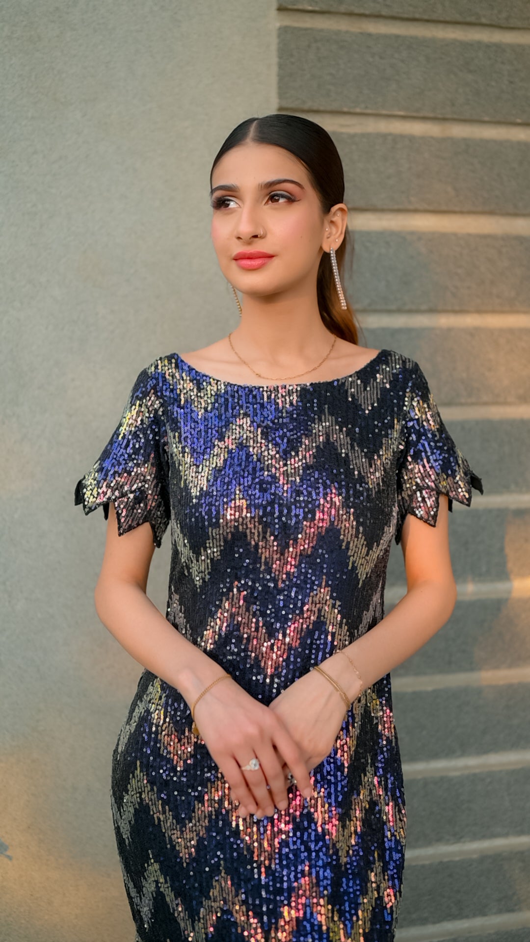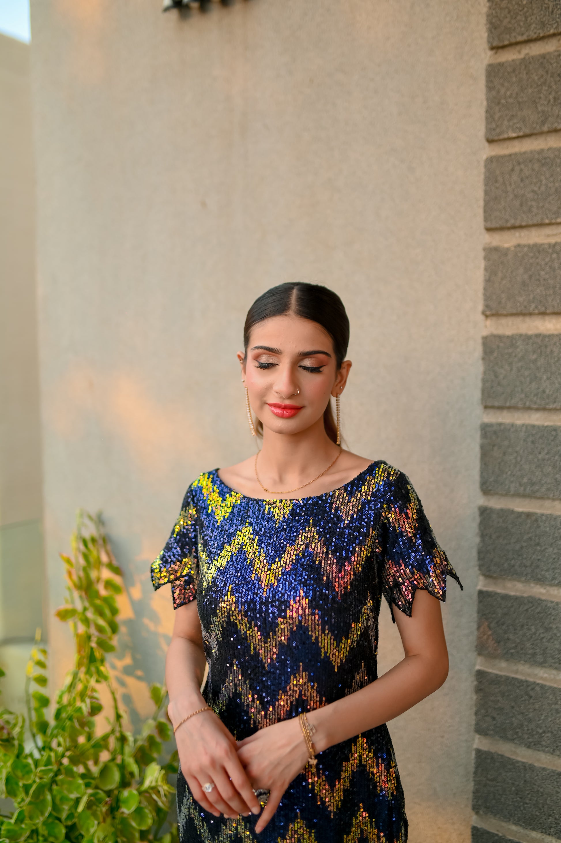 Navy-blue gown designed to dazzle. Featuring a richly embellished chevron sequin pattern across the bodice in hues of gold, orange and blue, this outfit perfectly balances tradition with modern flair. The short, fringed sleeves add a playful edge, while the voluminous net flare brings drama and elegance to every step. Ideal for evening soirées receptions, or festive celebrations.