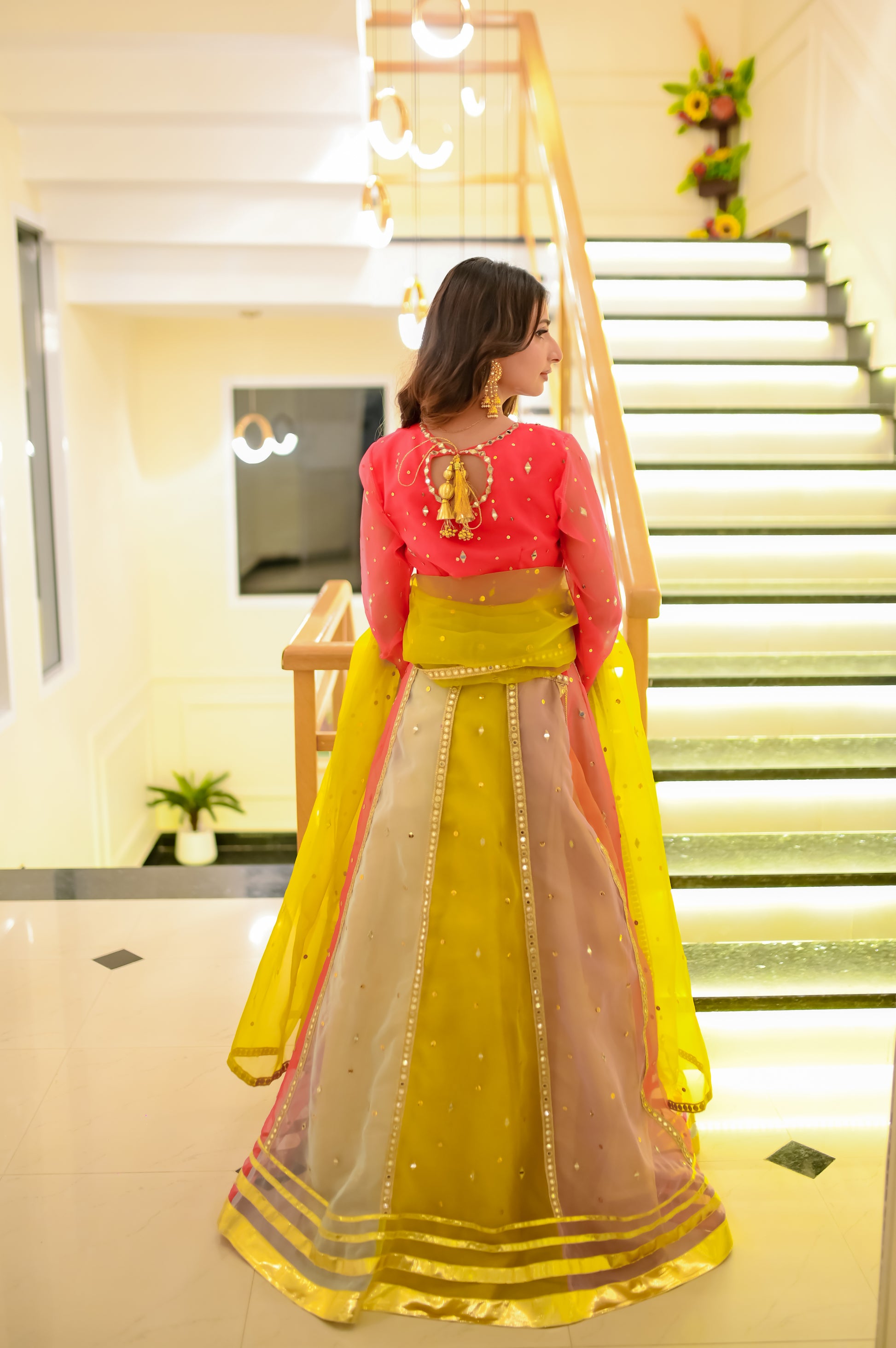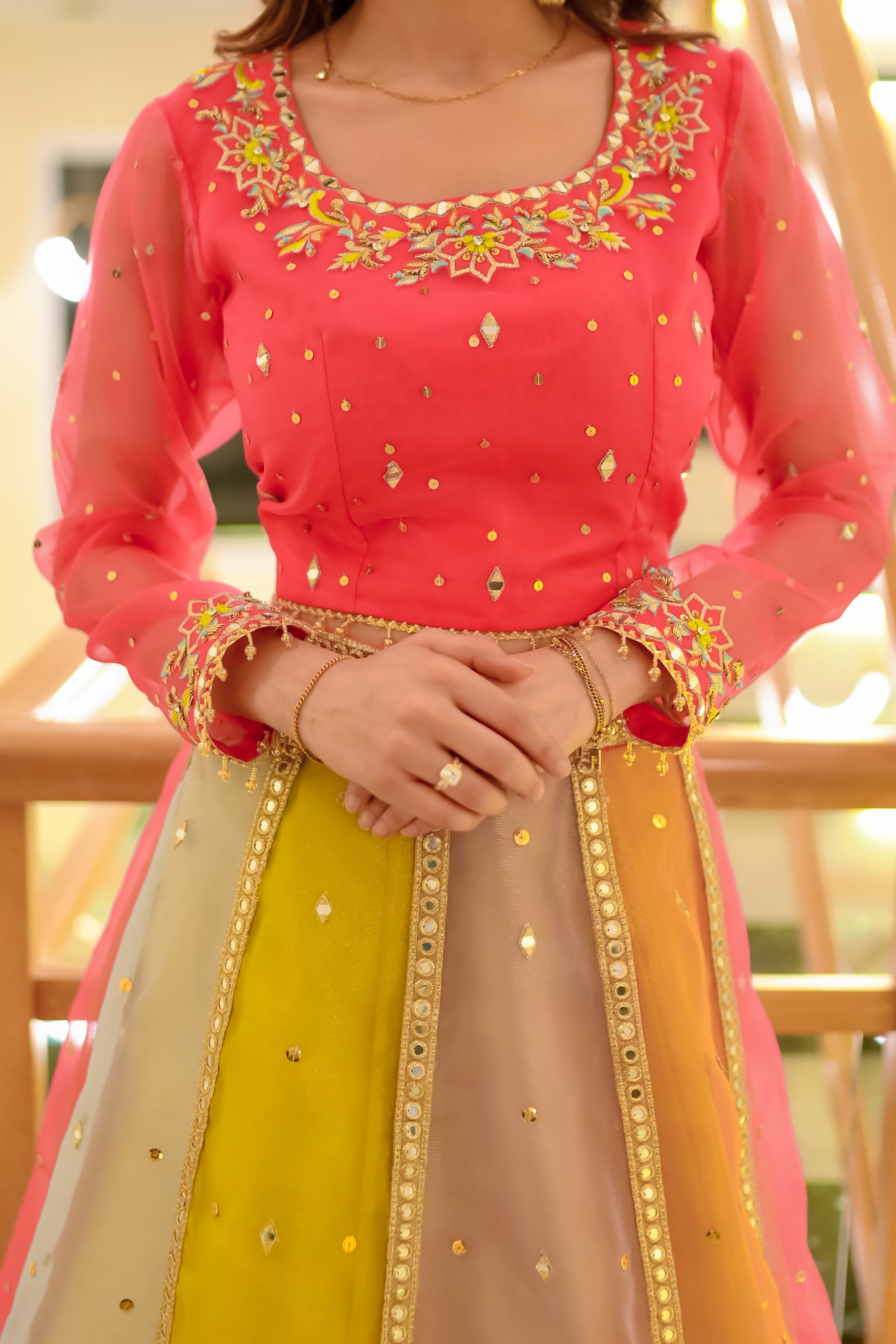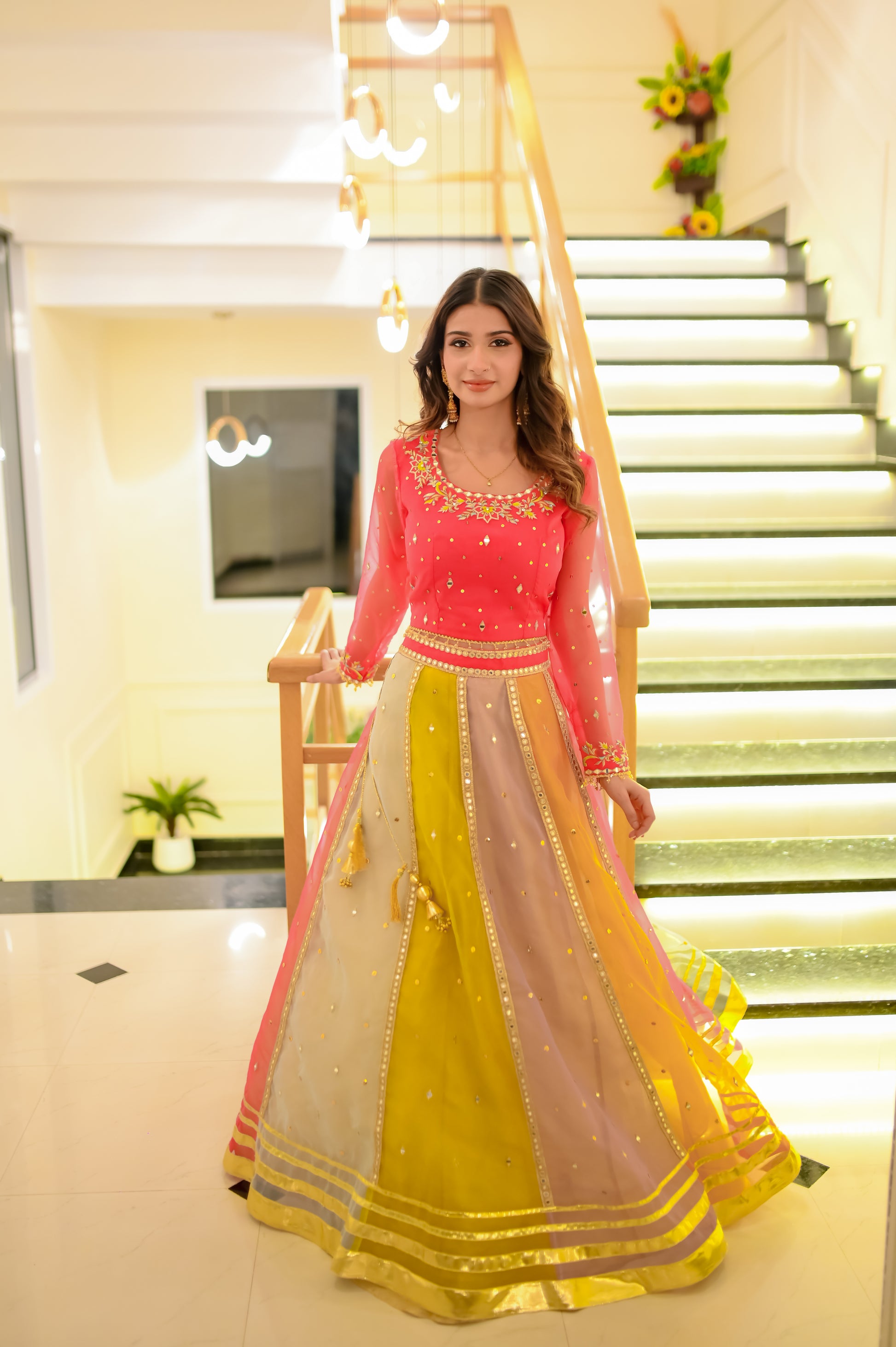 Celebrate vibrance with our ‘Sunset Bloom Lehenga’ set. The outfit features a fuchsia pink blouse with hand embroidered floral motifs and delicate gold mirror work on sheer sleeves and neckline adding a radiant sparkle, a scalloped hem and fitted bodice enhance the silhouette with elegance. The multi paneled lehenga in shades of mustard, lilac, aqua blue and dhani green is designed in a rich organza adorned with mirror butti work and gota patti borders. The contrasting dhani green organza dupatta features matching embroidery and detailed border that ties the entire look together.