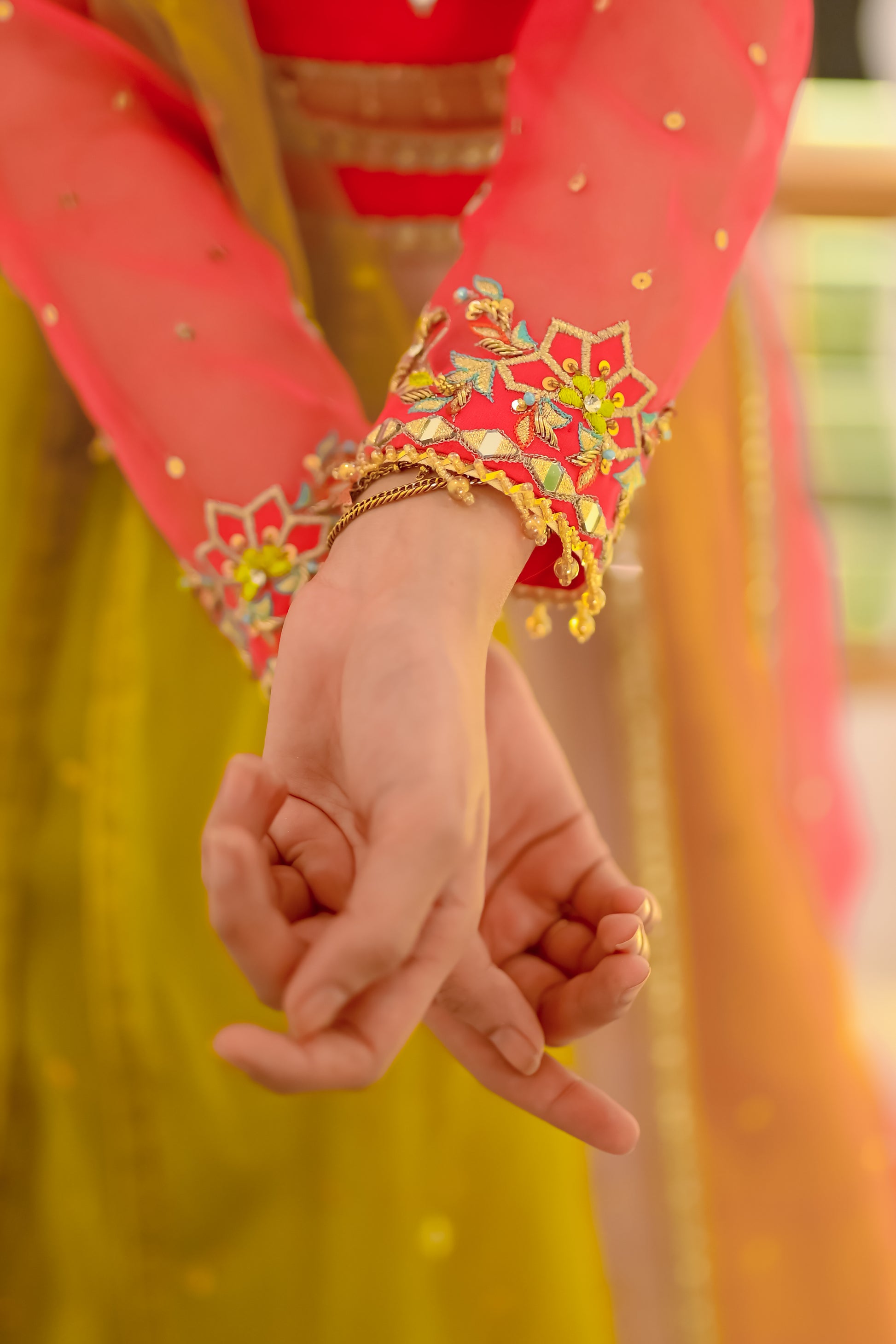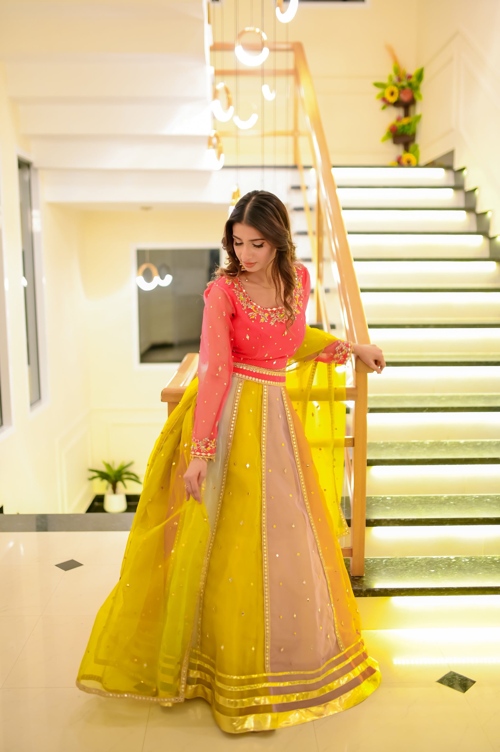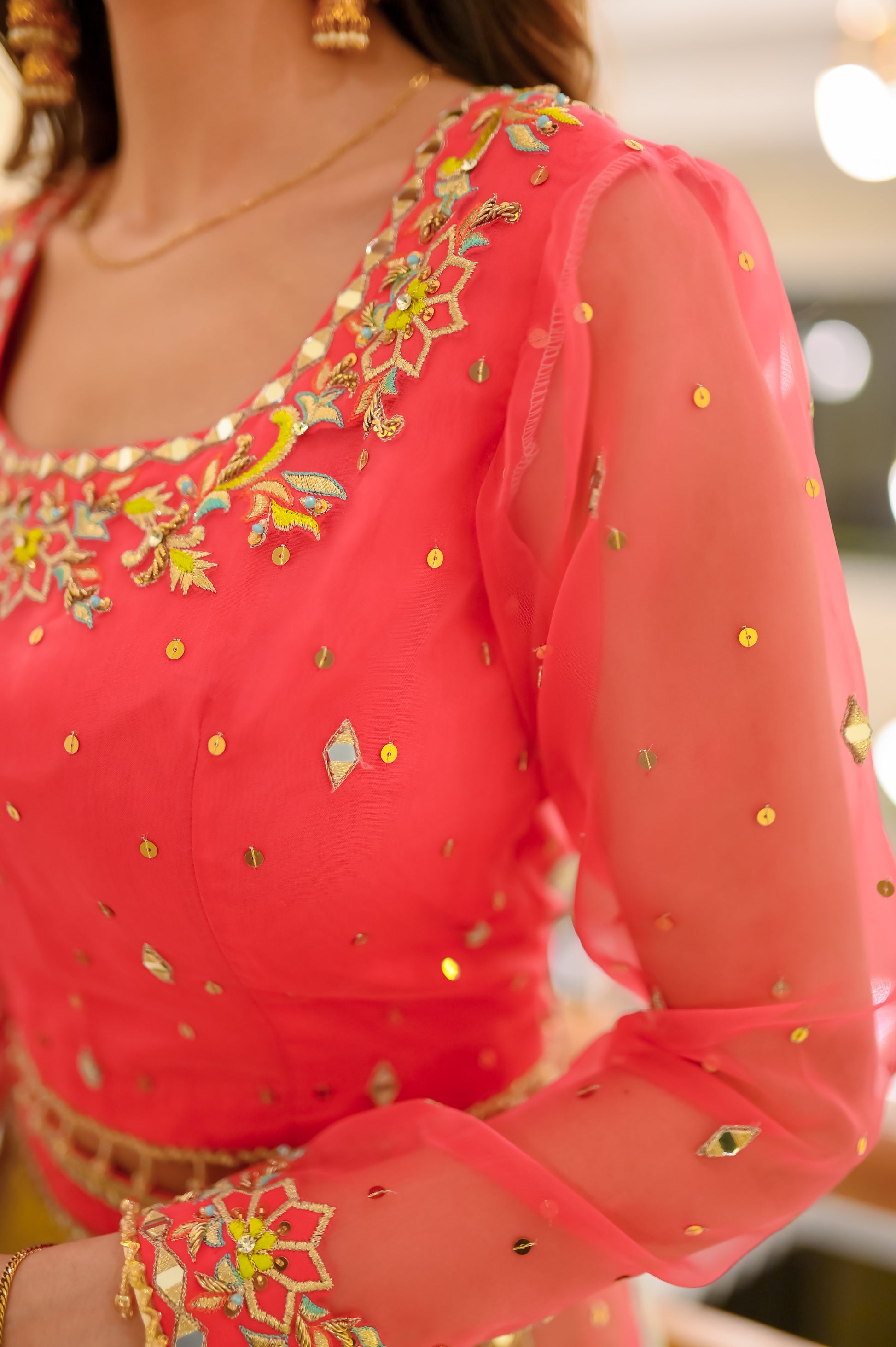 Celebrate vibrance with our ‘Sunset Bloom Lehenga’ set. The outfit features a fuchsia pink blouse with hand embroidered floral motifs and delicate gold mirror work on sheer sleeves and neckline adding a radiant sparkle, a scalloped hem and fitted bodice enhance the silhouette with elegance. The multi paneled lehenga in shades of mustard, lilac, aqua blue and dhani green is designed in a rich organza adorned with mirror butti work and gota patti borders. The contrasting dhani green organza dupatta features matching embroidery and detailed border that ties the entire look together.
