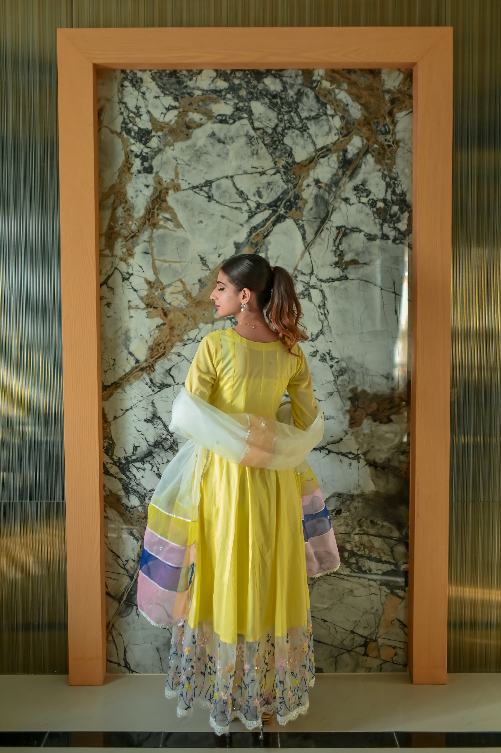 Radiate elegance in this radiant yellow Anarkali, designed to capture the essence of festive charm. The flowing silhouette features delicate sequin embellishments scattered across the bodiceand sleeves, while the hem is adorned with a beautifully embroidered flora lmesh border, adding a whimsical touch of pastel color and texture.The look is completed with a sheerdupatta featuring soft pastel panels and subtle shimmer accents, perfectly complementing the cheerful tone of the ensemble.