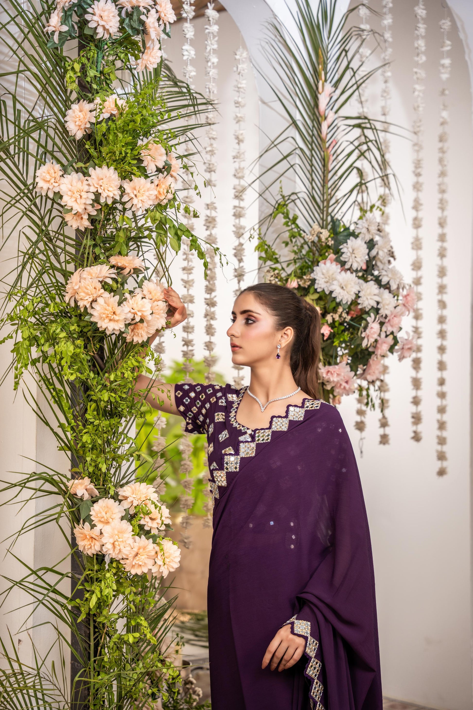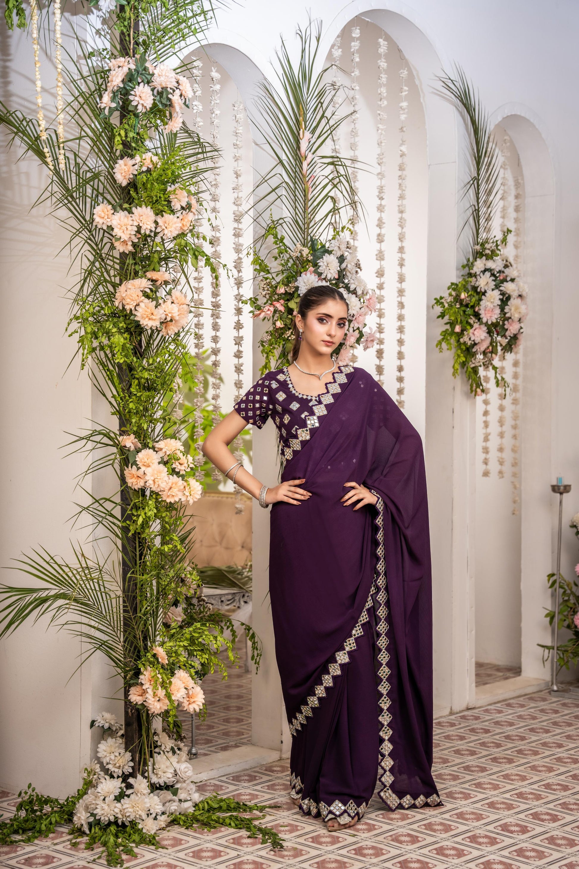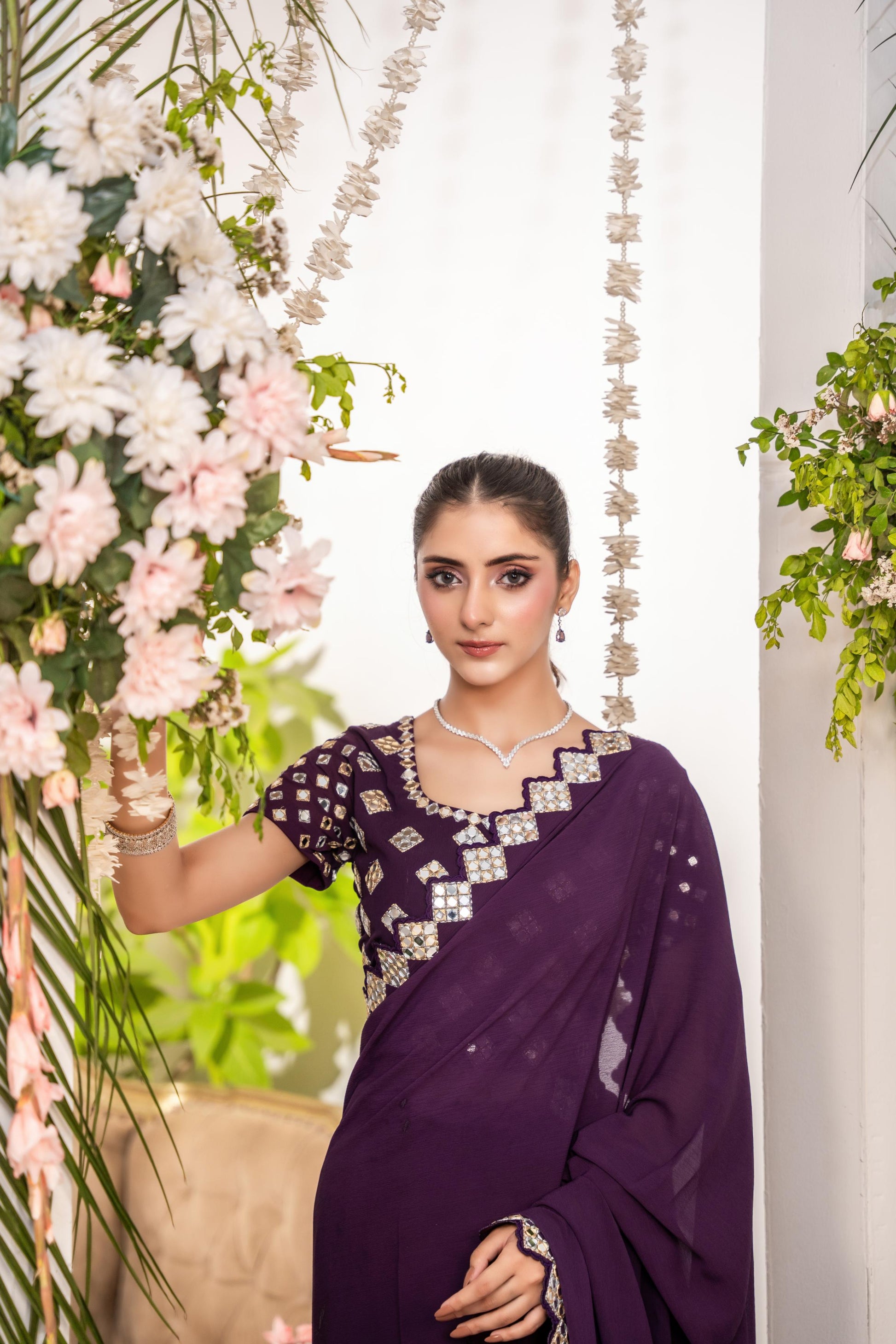 Crafted from flowing georgette, this purple saree is adorned with intricate mirror work along the border, forming a striking diamond pattern that adds a shimmering edge to its classic silhouette.