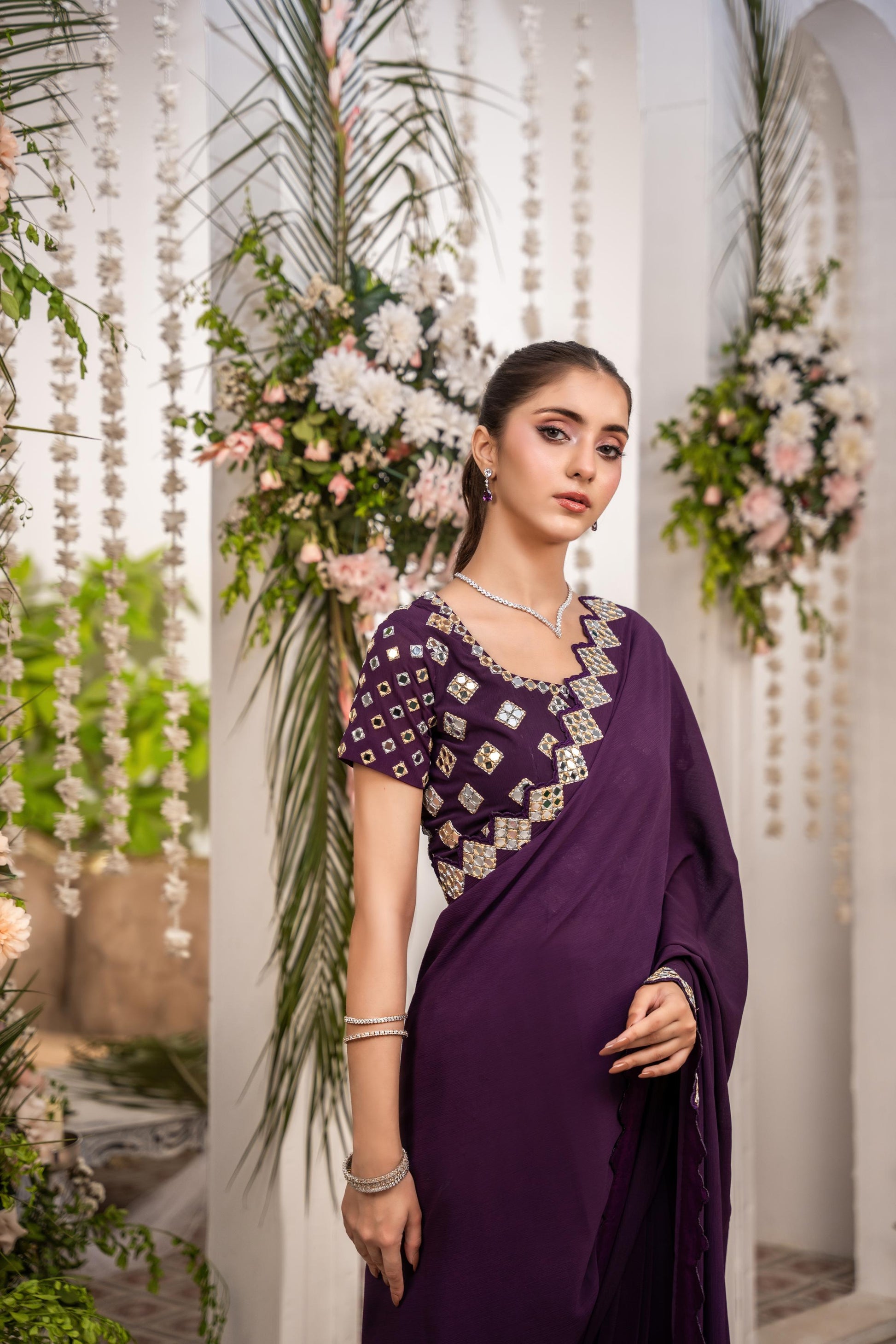The matching blouse features all-over mirror embroidery on a rich purple base, adding a contemporary twist to this traditional ensemble.